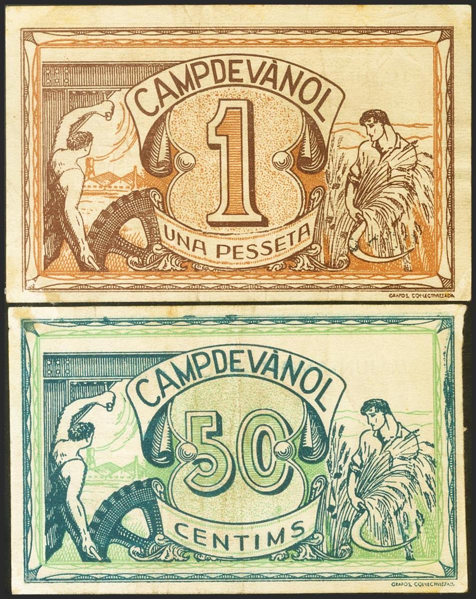 CAMPDEVANOL (GERONA). 50 Cent and 1 Peseta. June 1, 1937. (González: 7328/29). Rare complete series. Good Very Fine.
