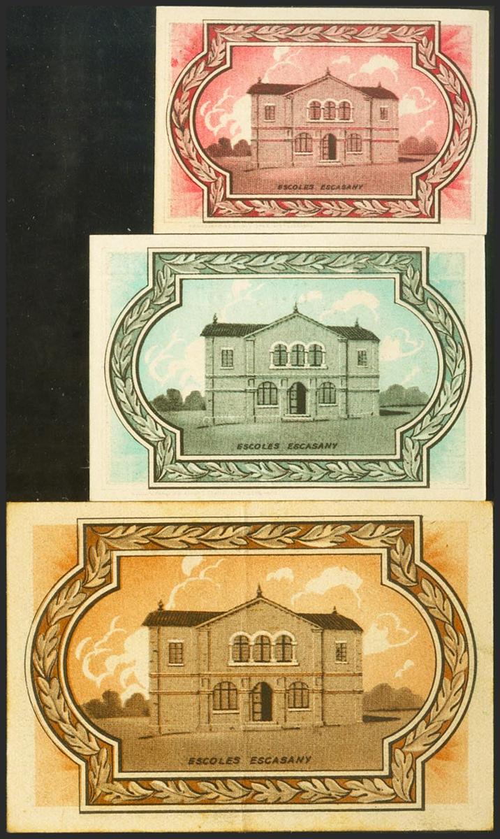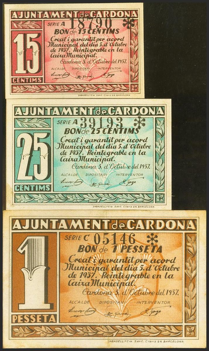 CARDONA (BARCELONA). 15 Cents, 25 Cents and 1 Peseta. October 5, 1937. Series A, A and C, respectively. (Gonzalez: 7395, 7396, 7398). Extremely Fine.