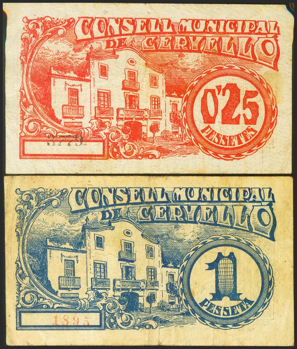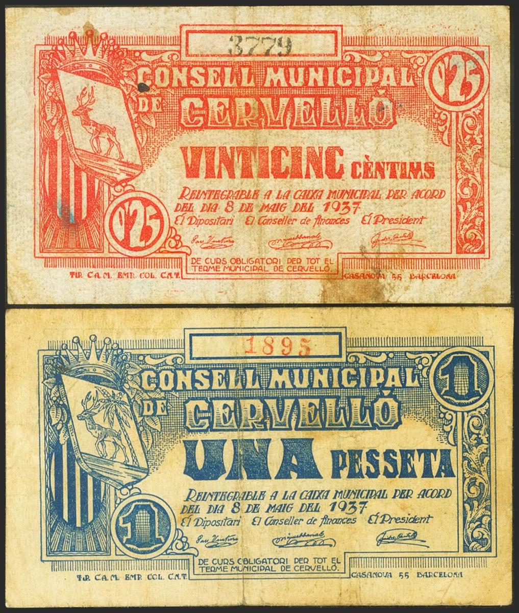 CERVELLO (BARCELONA). 25 Cents and 1 Peseta. May 8, 1937. (González: 7552, 7553). Almost Very Fine.