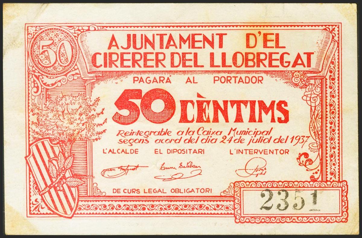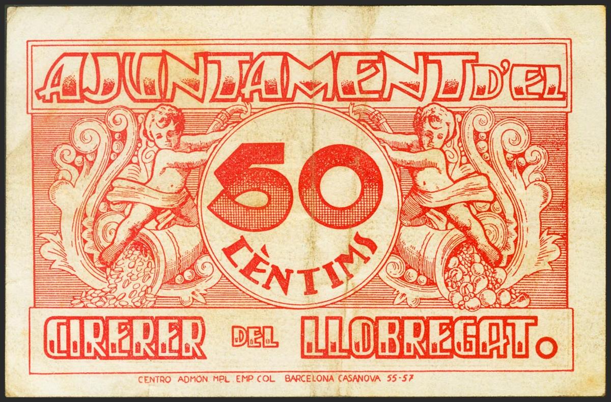 CIRERER OF LLOBREGAT (BARCELONA). 50 cents. July 24, 1937. (González: 7597). unusual. Good Very Fine.