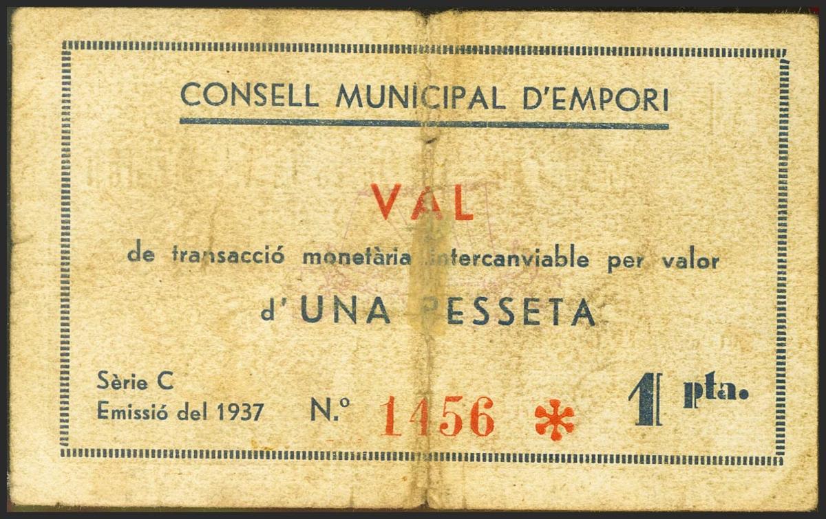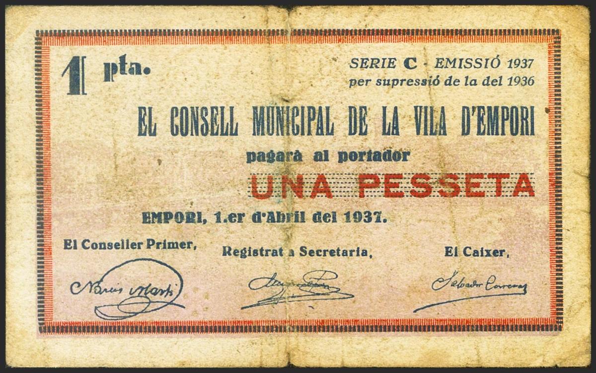 EMPORI (GERONA). 1 Peseta. April 1, 1937. Series C. (González: 7738). Very Fine.