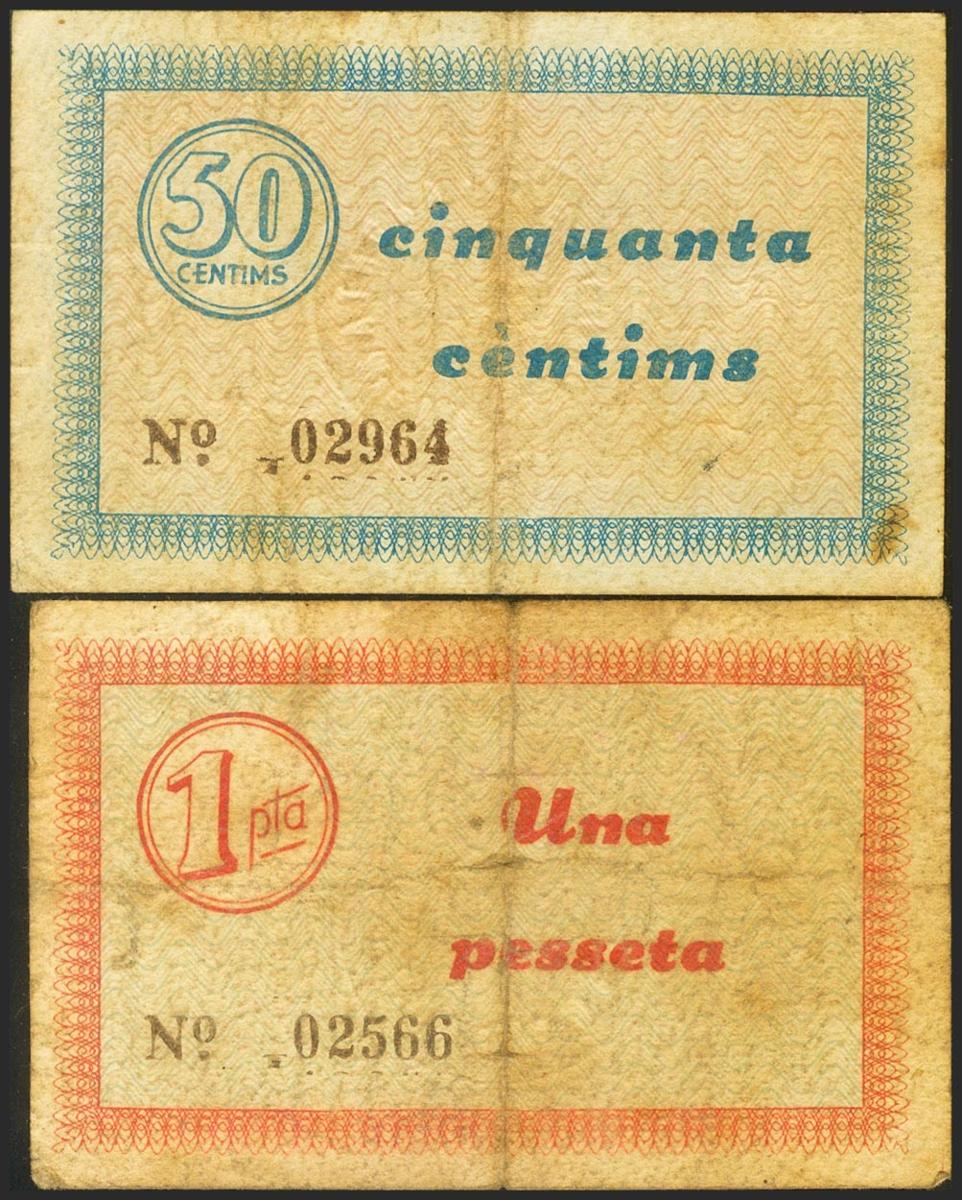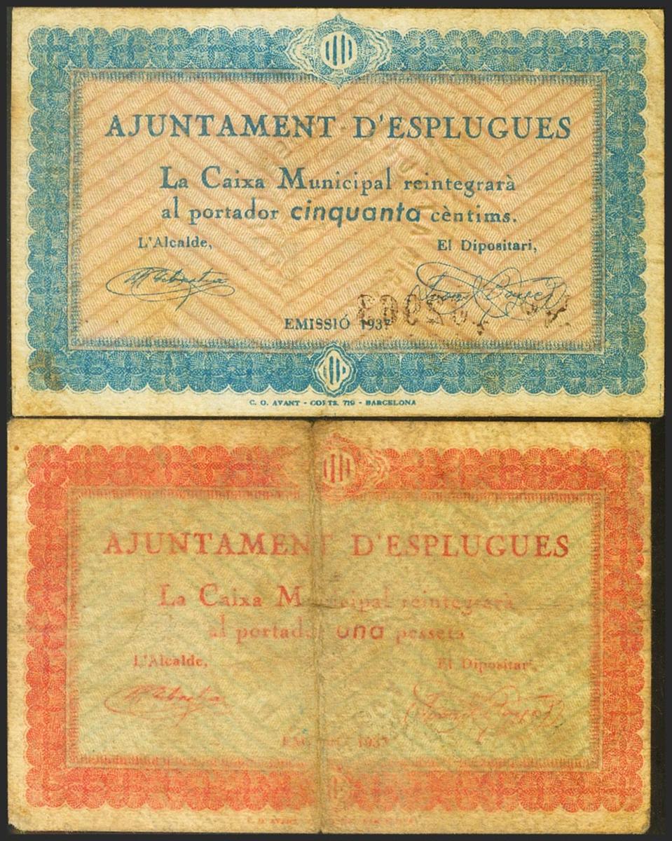 ESPLUGUES DE LLOBREGAT (BARCELONA). 50 Cents and 1 Peseta. 1937. (Gonzalez: 7779/80). Complete series. Almost Very Fine/ Very Fine.