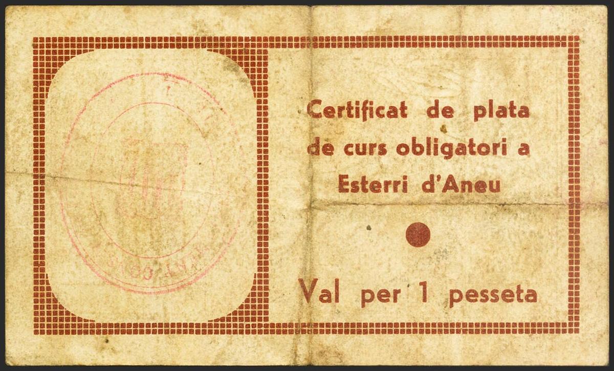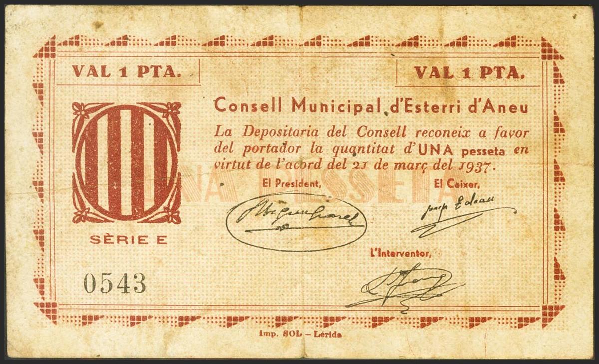 English ESTERRI D´ANEU (LERIDA). 1 Peseta. March 21, 1937. Series E. (González: 7802). Rare. Very Fine.