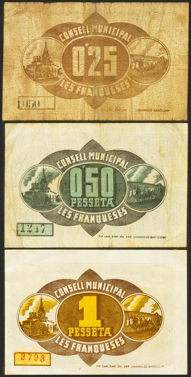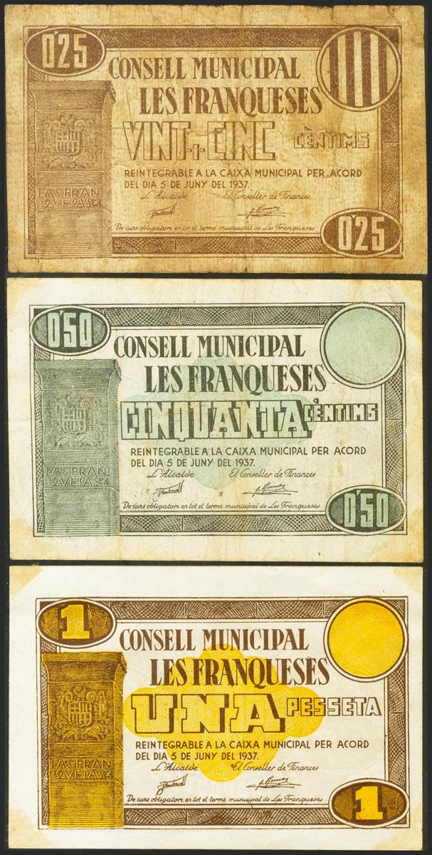 LES FRANQUESES OF THE VALLEYS (BARCELONA). 25 Cents, 50 Cents and 1 Peseta. June 5, 1937. (González: 7929/31). Rare complete series. Extremely Fine/ Almost Very Fine.