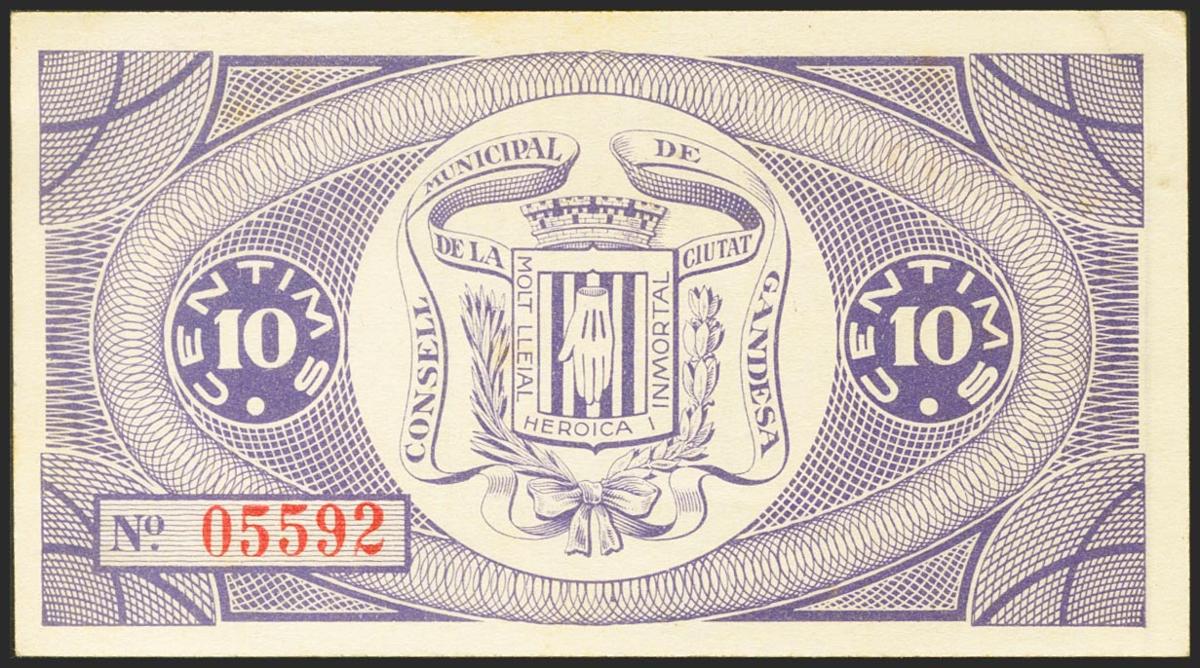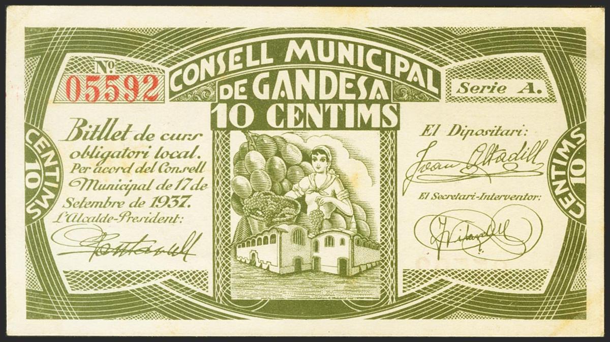 GANDESA (TARRAGONA). 10 cents. September 17, 1937. Series A. (González: 7961). Good Extremely Fine.