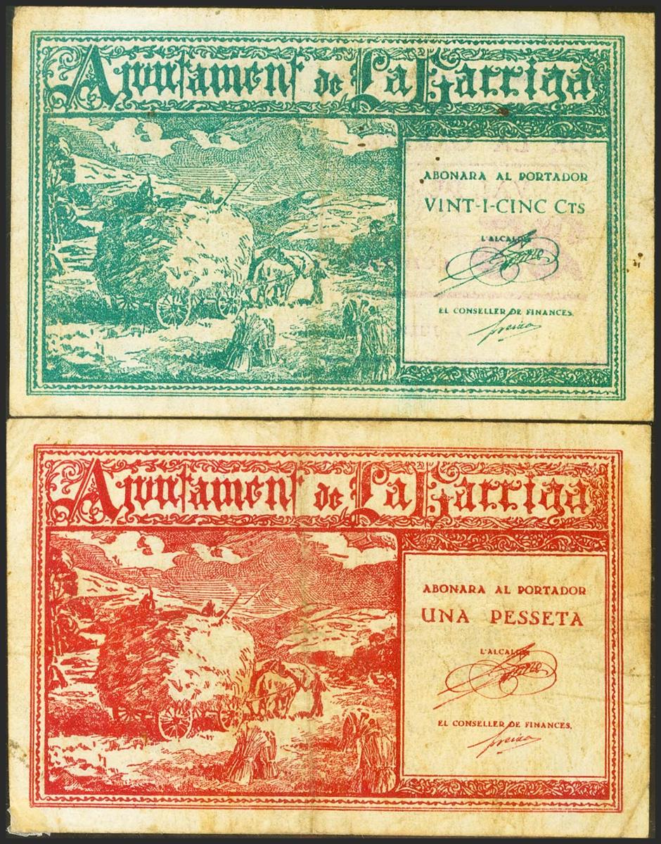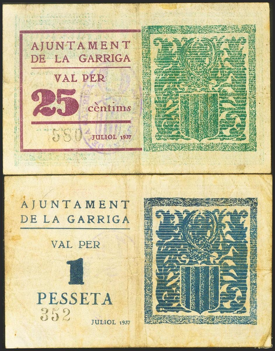 LA GARRIGA (BARCELONA). 25 Cents and 1 Peseta. July 1937. (González: 7986, 7988). unusual. Very Fine/ Almost Very Fine.