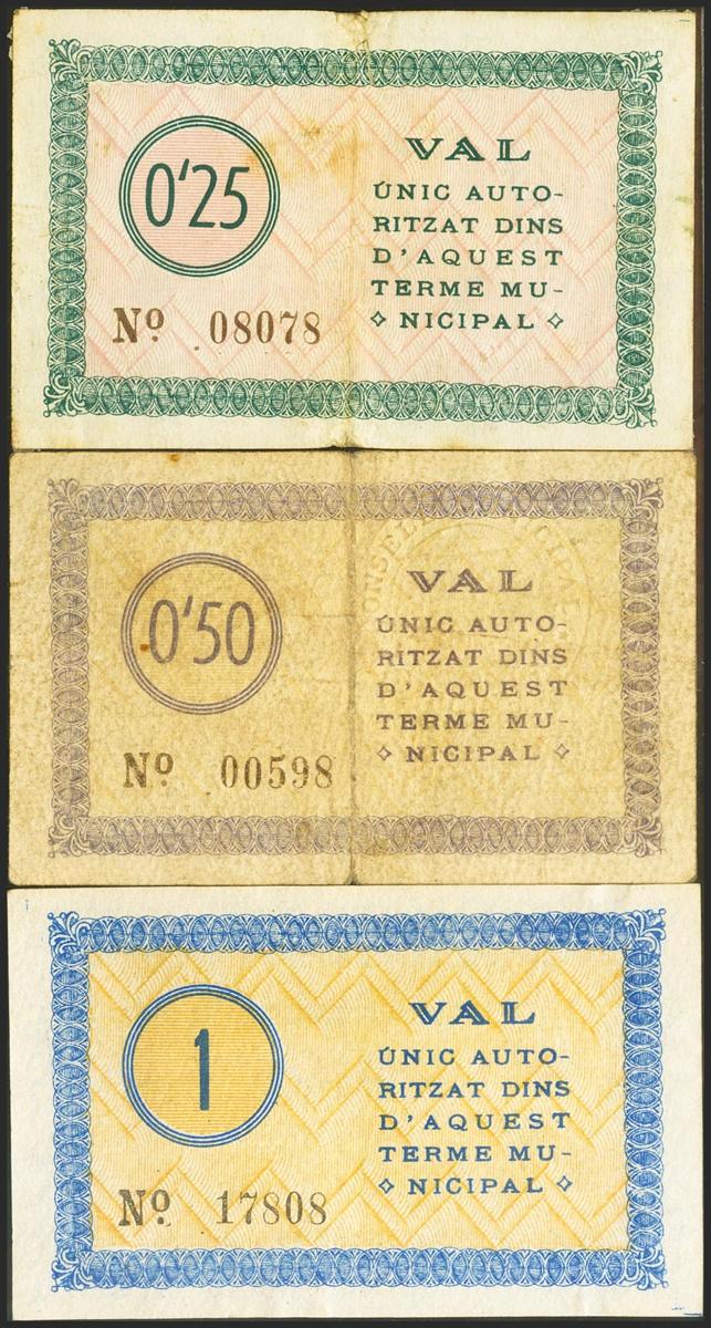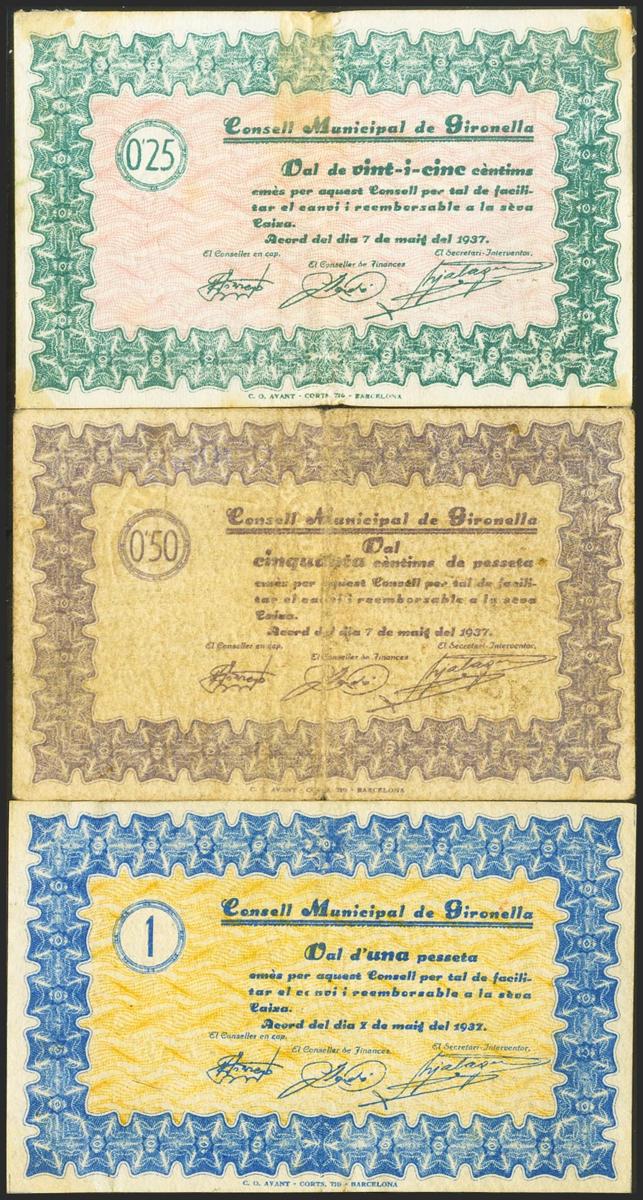 English GIRONELLA (BARCELONA). 25 Cents, 50 Cents and 1 Peseta. May 7, 1937. (González: 8043/45). Rare complete series. Very Fine/ Good Very Fine.