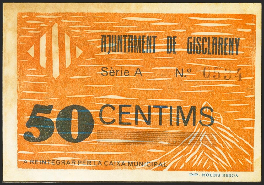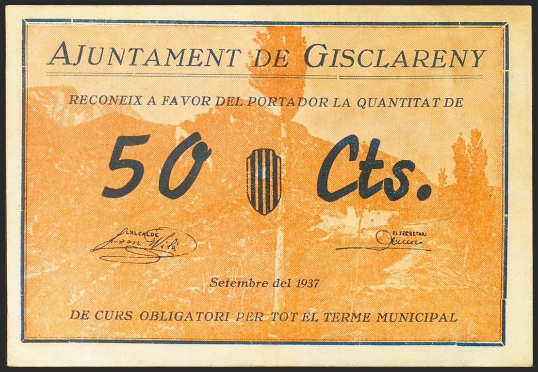 GISCLARENY (BARCELONA). 50 cents. September 1937. Series A. (González: 8051). Very rare. Good Very Fine.