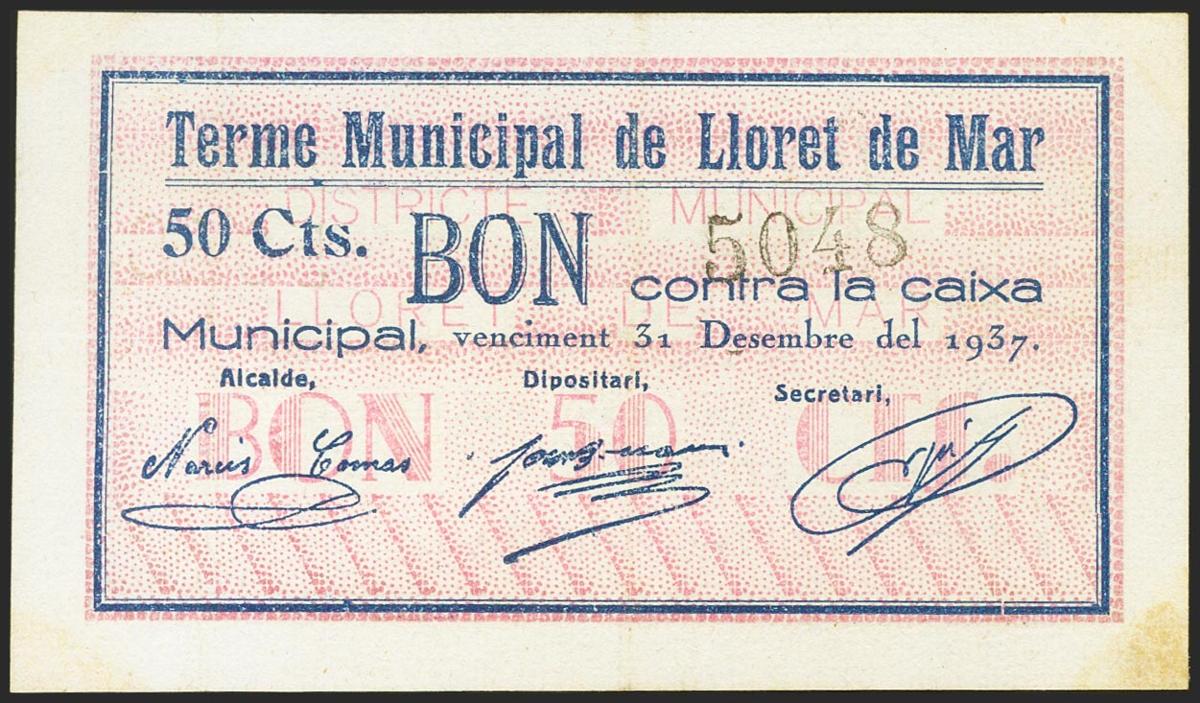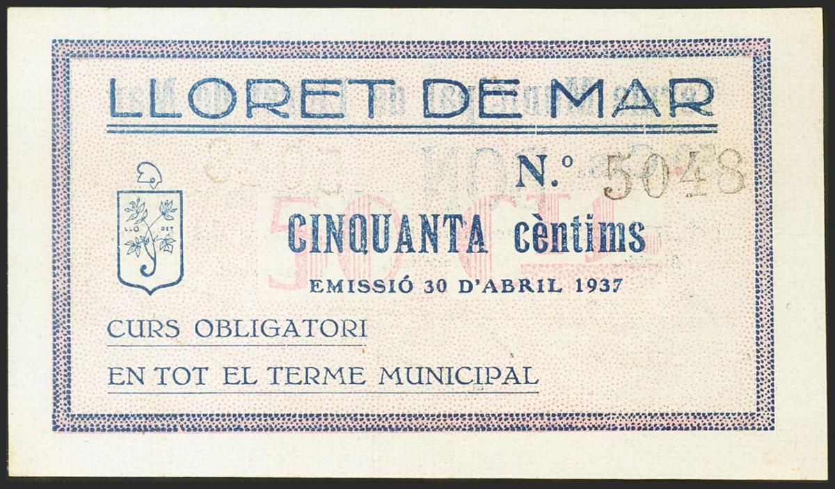 English LLORET DE SEA (GERONA). 50 cents. April 30, 1937. (González: 8433). Rare. Good Very Fine.