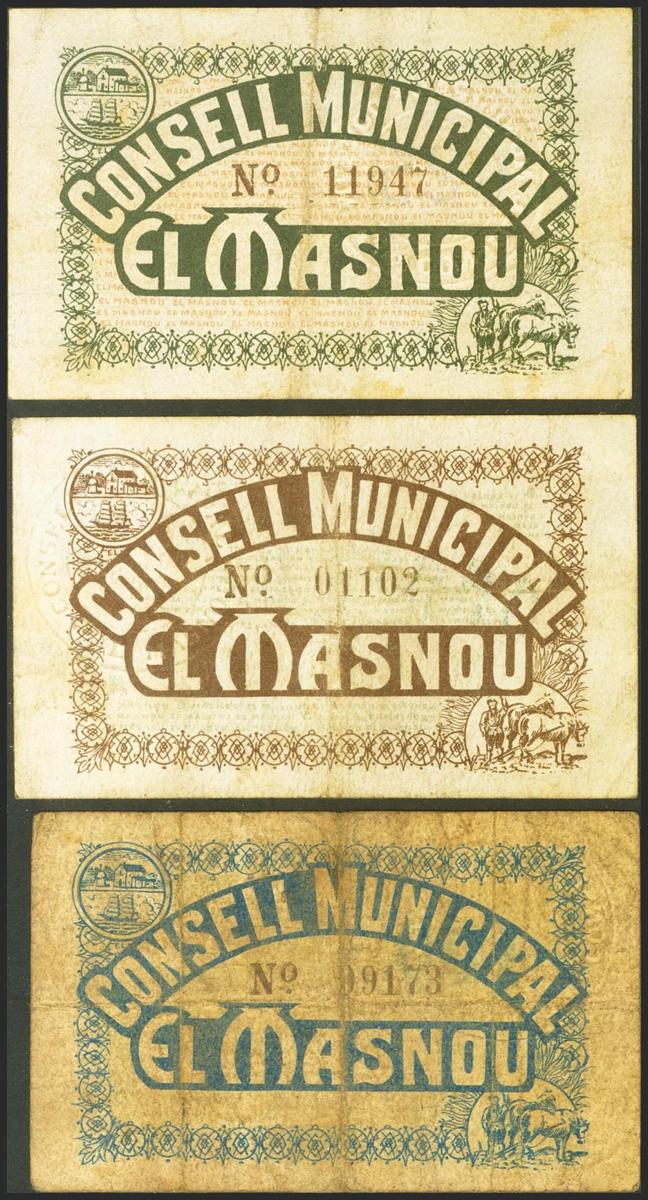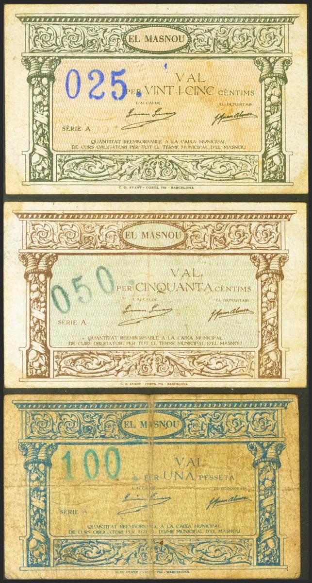 EL MASNOU (BARCELONA). 25 Cents, 50 Cents and 1 Peseta. (1936ca). Series A, all three tickets. (González: 8605/07). Rare complete series. Almost Very Fine/ Good Very Fine.
