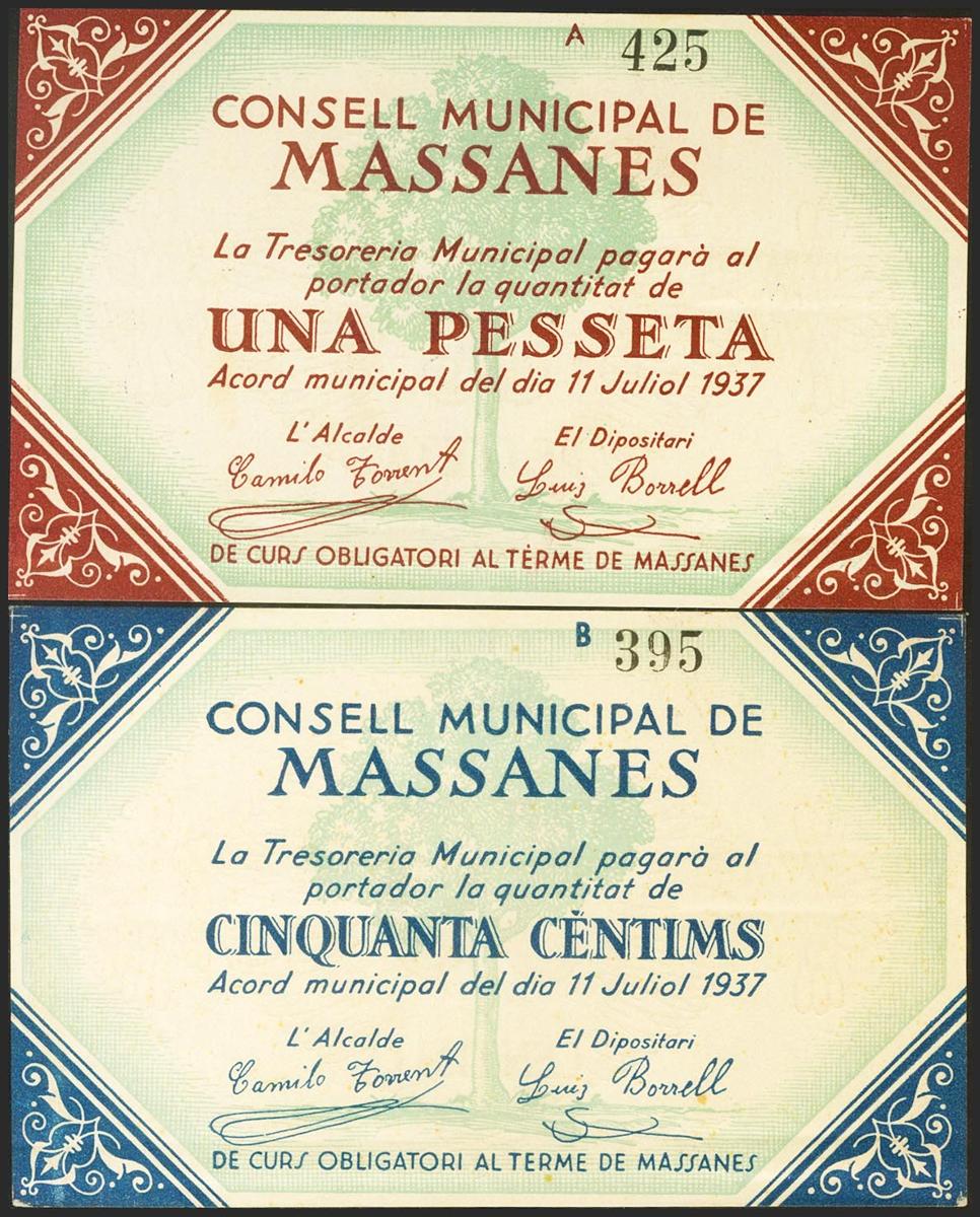 MASSANES (GERONA). 50 Cents and 1 Peseta. July 11, 1937. Series A and B, respectively. (González: 8652/53). Very rare complete series. Good Extremely Fine.