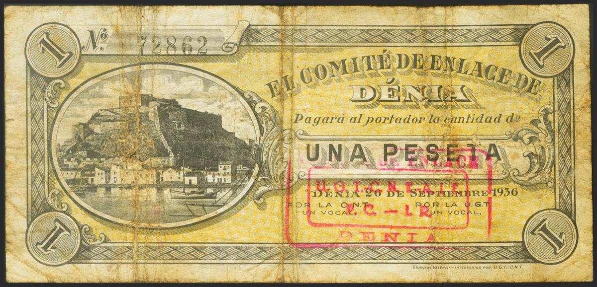 DENIA (ALICANTE). 1 Peseta. September 26, 1936. (González: 2212). Very Fine.