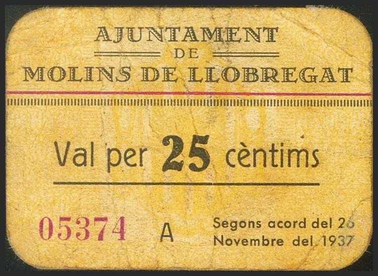 English MILLS OF LLOBREGAT (BARCELONA). 25 cents. November 26, 1937. Series A. (González: 8701). Good Very Fine.
