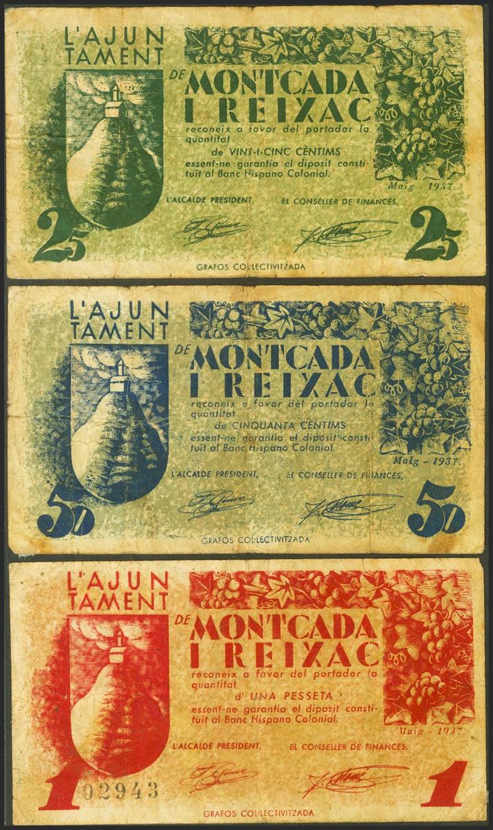 English MONTCADA AND REIXAC (BARCELONA). 25 Cents, 50 Cents and 1 Peseta. May 1937. (González: 8773/75). Rare complete series. Very Fine/ Good Very Fine.