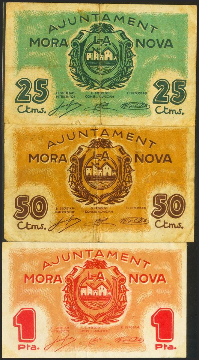 MORA LA NOVA (TARRAGONA). 25 Cents, 50 Cents and 1 Peseta. (1936ca). (Gonzalez: 8847/49). Rare complete series. Very Fine/ Good Very Fine.