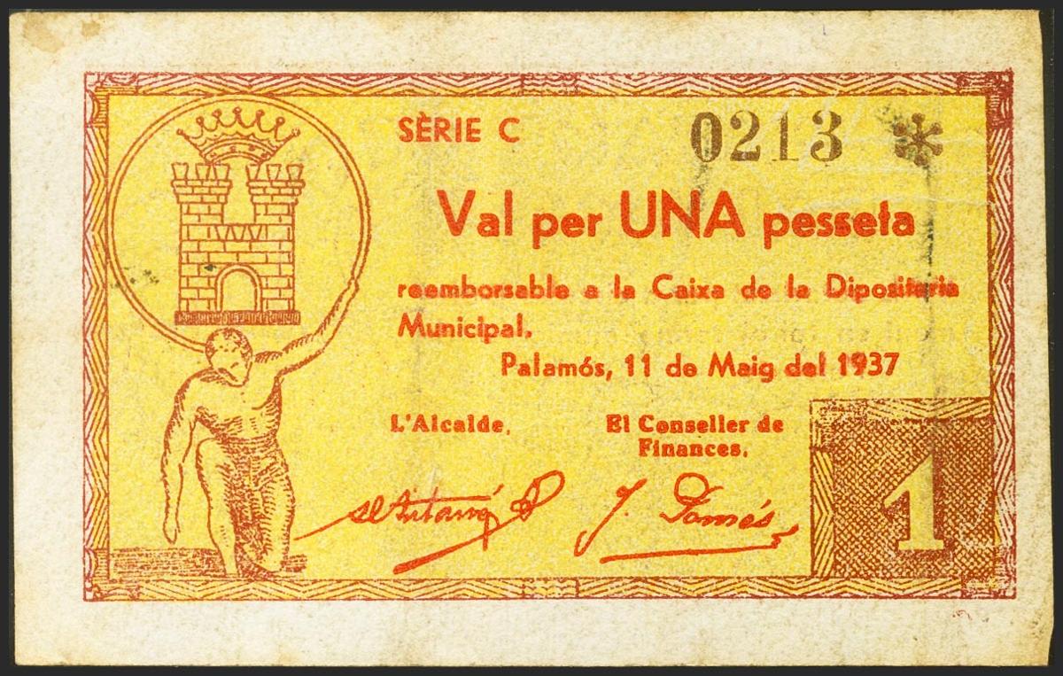 English PALAMOS (GERONA). 1 Peseta. May 11, 1937. Series C. (González: 9098). unusual. Very Fine.