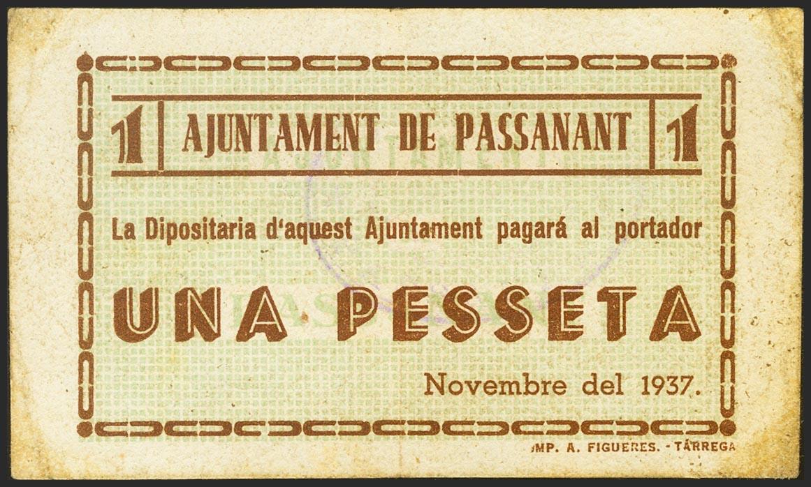 PASSANANT (TARRAGONA). 1 Peseta. November 1937. (González: 9166). Rare. Very Fine.