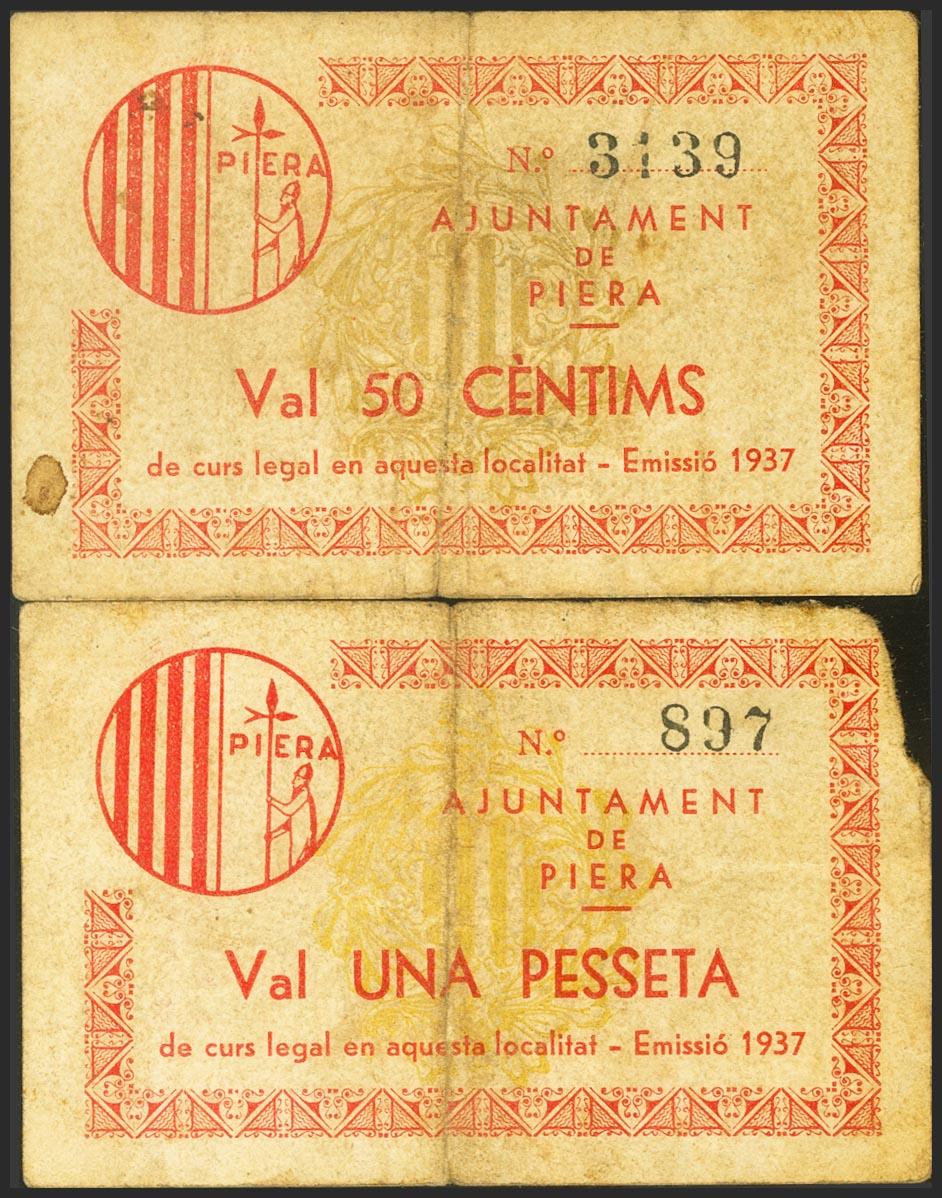 PIERA (BARCELONA). 50 Cents and 1 Peseta. 1937. (González: 9210/11). Rare complete series. Good Very Fine/ Good.