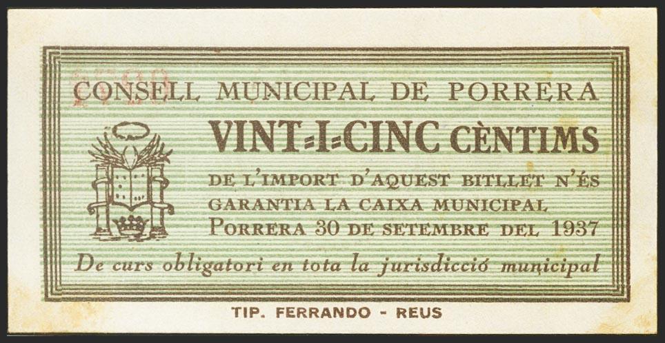 PORRERA (TARRAGONA). 25 cents. September 30, 1937. (González: 9402). Rare. Good Extremely Fine.