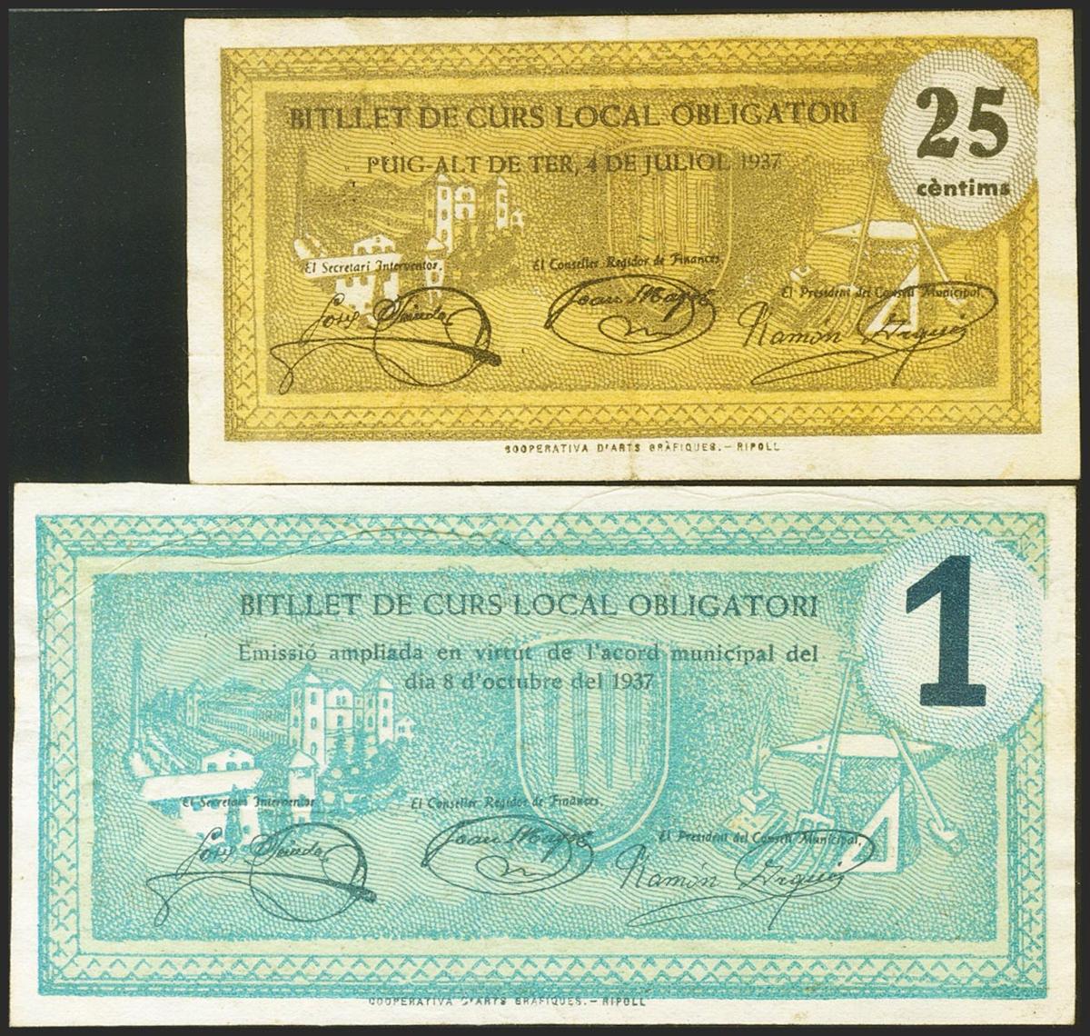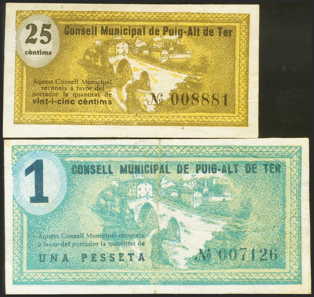 PUIG ALT DE TER (GERONA). 25 Cents and 1 Peseta. July 4, 1937. (González: 9478/79). Rare complete series. Good Very Fine.