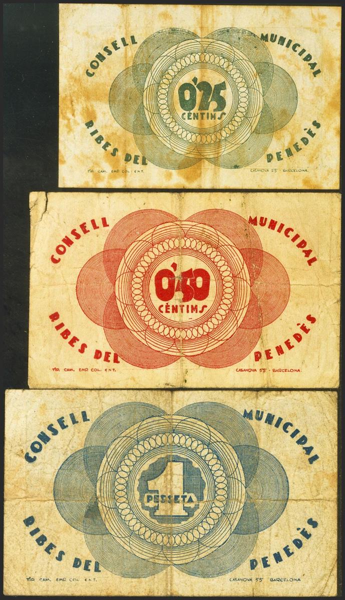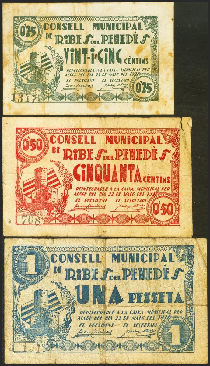 RIBES OF THE PENEDES (BARCELONA). 25 Cents, 50 Cents and 1 Peseta. May 22, 1937. (González: 9625/27). Rare complete series. Almost Very Fine/ Good Very Fine.