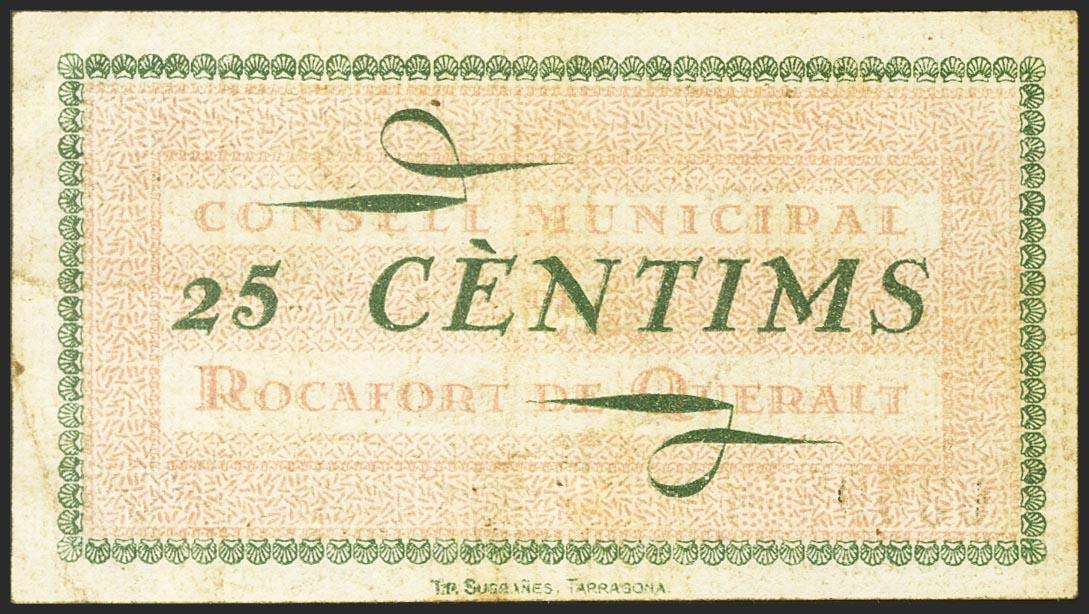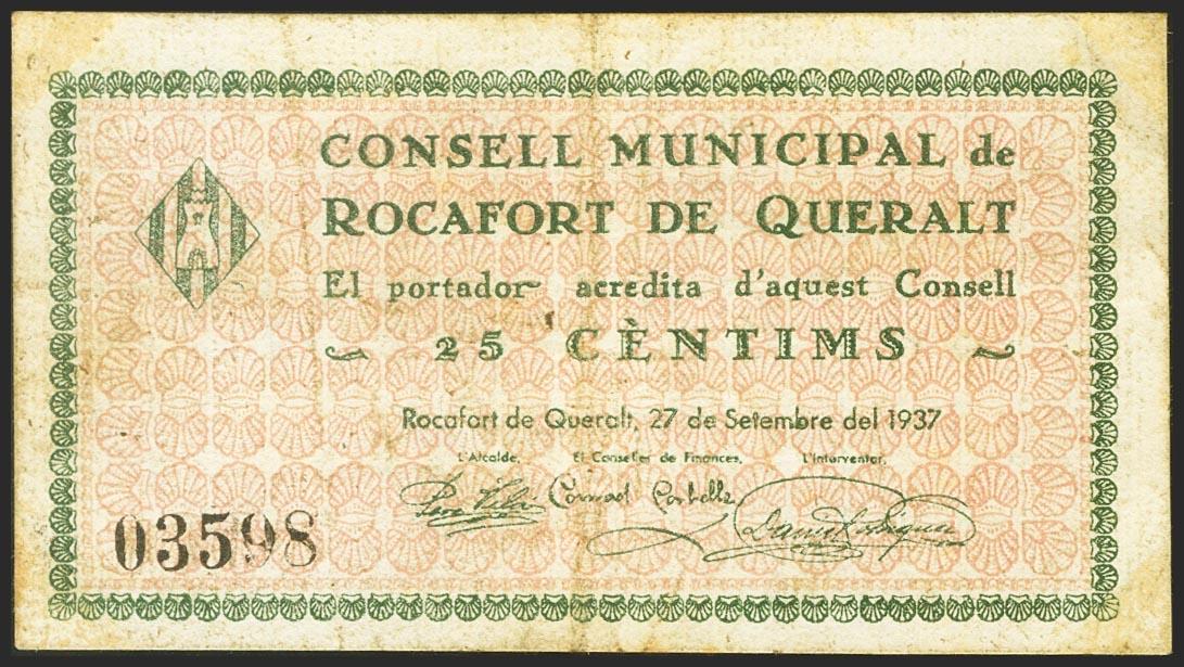 ROCAFORT DE QUERALT (TARRAGONA). 25 cents. September 27, 1937. (González: 9705). unusual. Good Very Fine.