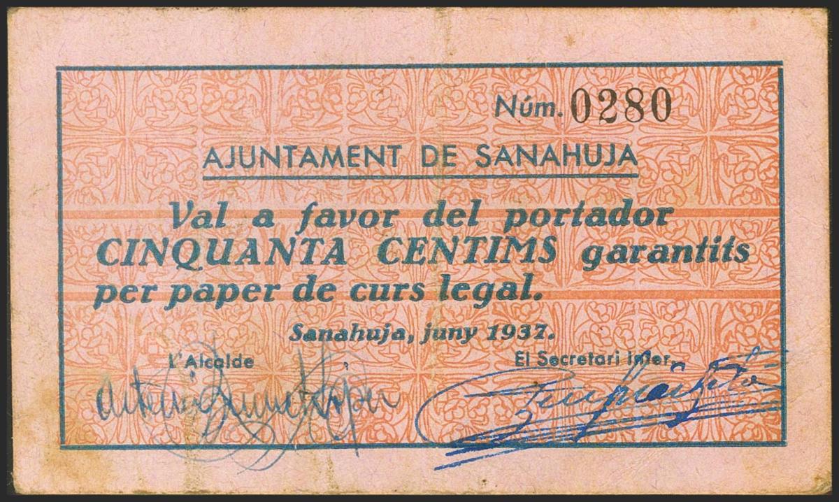 English SANAHUJA (LERIDA). 50 cents. June 1937. (González: 9846). Very rare. Very Fine.