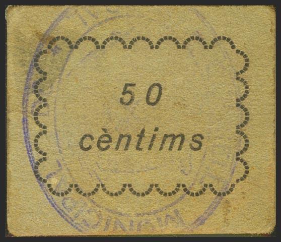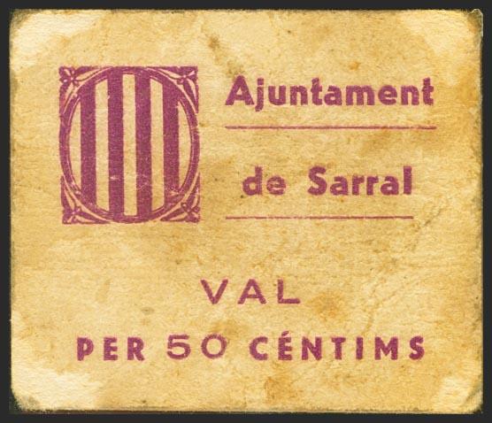 SARRAL (TARRAGONA). 50 cents. (1936ca). (Gonzalez: 9880). Rare. Good Very Fine.