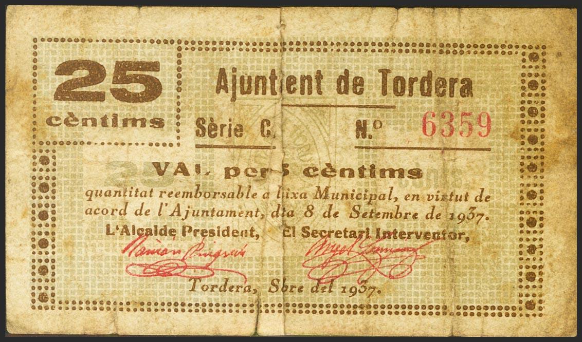 TORDERA (BARCELONA). 25 cents. September 8, 1937. Series C. (González: 10306). Unusual, stitched bill. Good.