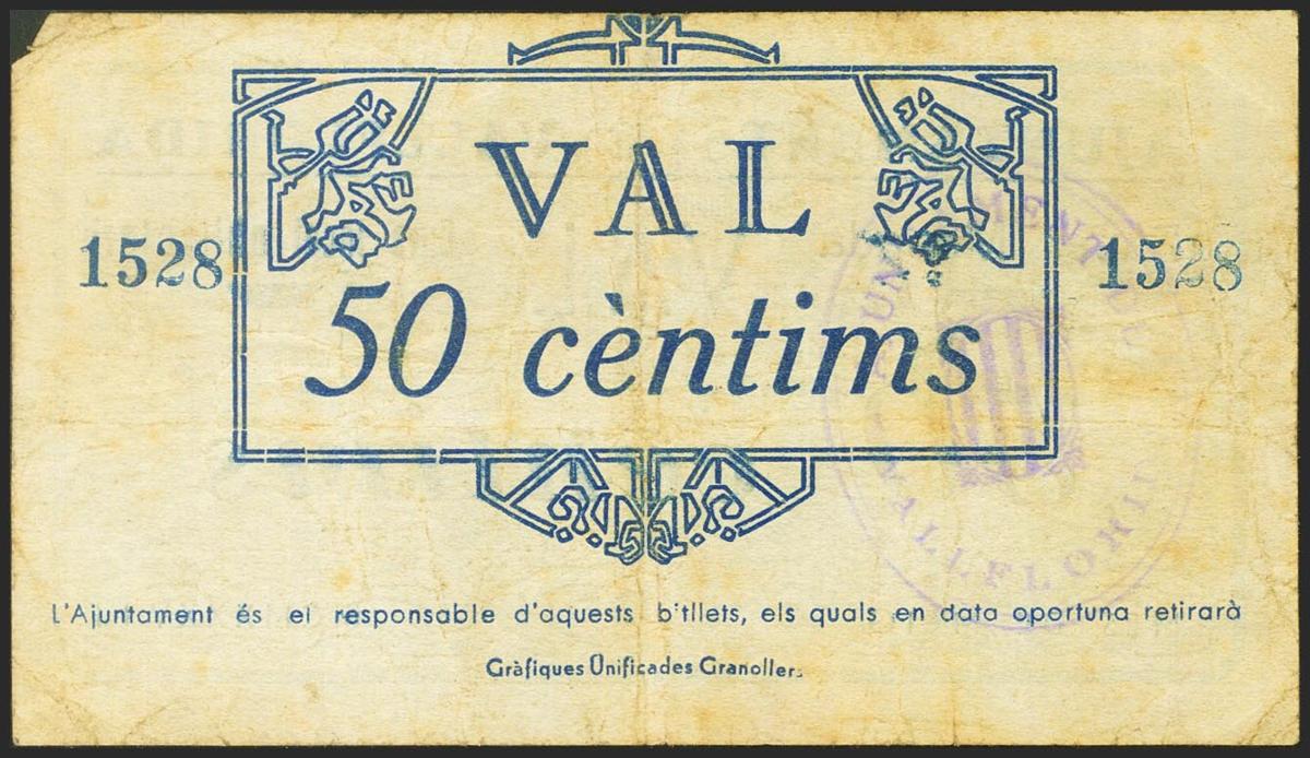 English VALLFLORIDA (BARCELONA). 50 cents. May 1937. (González: 10509). Rare. Fine.