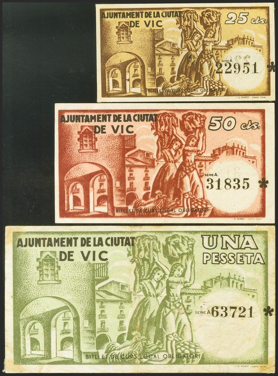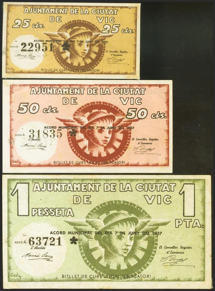 English VIC (BARCELONA). 25 Cents, 50 Cents and 1 Peseta. June 7, 1937. Series A, the three bills. (González: 10629/31). Complete series. Extremely Fine.