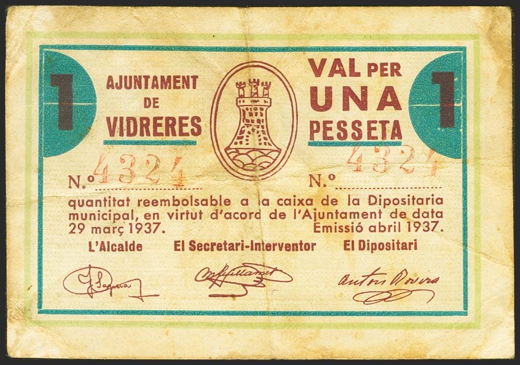 English VIDRERES (GERONA). 1 Peseta. April 1937. (González: 10647). Rare. Very Fine.