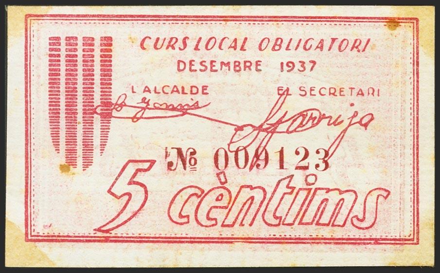 VILASSAR DE DALT (GERONA). 5 cents. December 1937. (González: 10857). Extremely Fine.