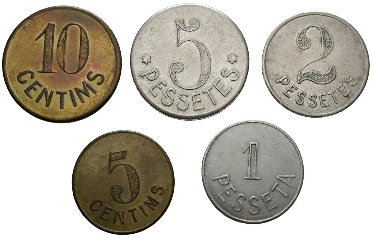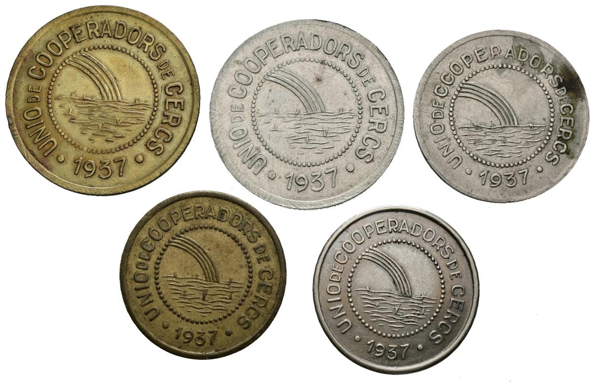 English CERES (BARCELONA). 5 Cents, 10 Cents, 1 Peseta, 2 Pesetas and 5 Pesetas. (1936ca). Union of Cooperators. Extremely Fine.
