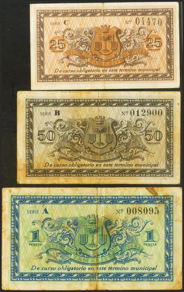 English TAMARITE (HUESCA). 25 Cents, 50 Cents and 1 Peseta. October 10, 1937. Series C, B and A, respectively. (Gonzalez: 4972/74). Complete series. Very Fine.