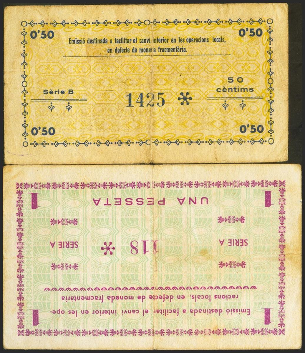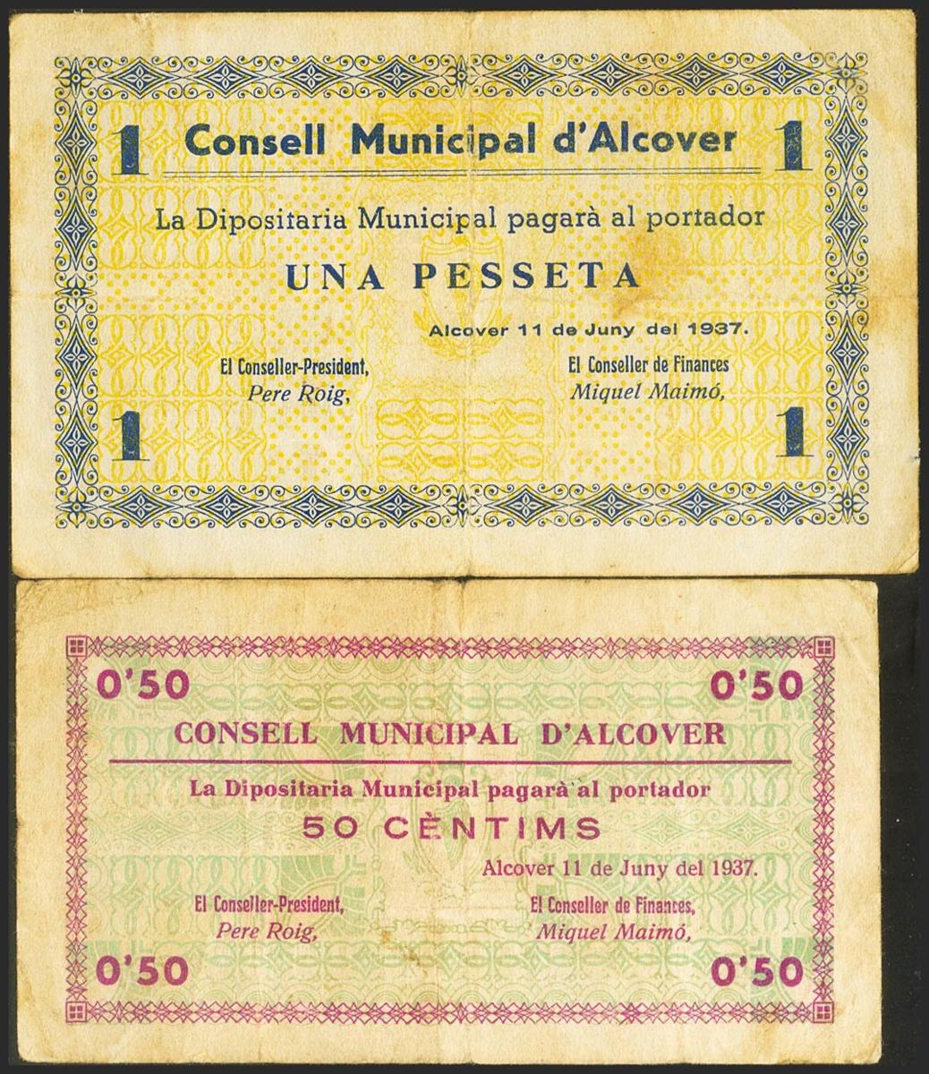 English ALCOVER (TARRAGONA). 50 Cents and 1 Peseta. June 11, 1937. Series B and A respectively. (Gonzalez: 6146/47). Rare complete series. Very Fine.