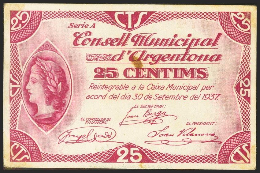 English ARGENTINA (BARCELONA). 25 cents. (1936ca). (Gonzalez: 6390). Good Very Fine.