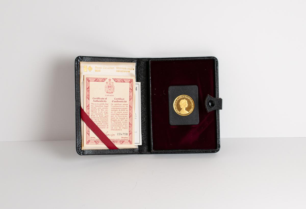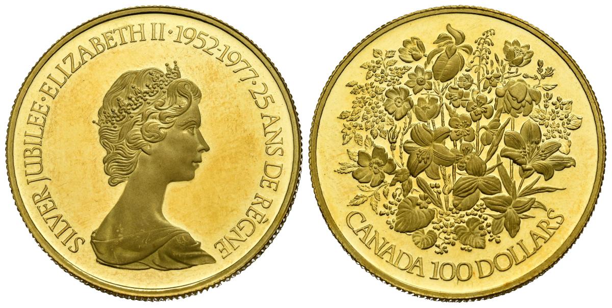 English CANADA. 100 dollars. (Aug. 16.96g/25mm). 1977. 25th Anniversary of the accession to the throne of Queen Elizabeth II. (Km#119). PROOF. Includes box and certificate of authenticity.