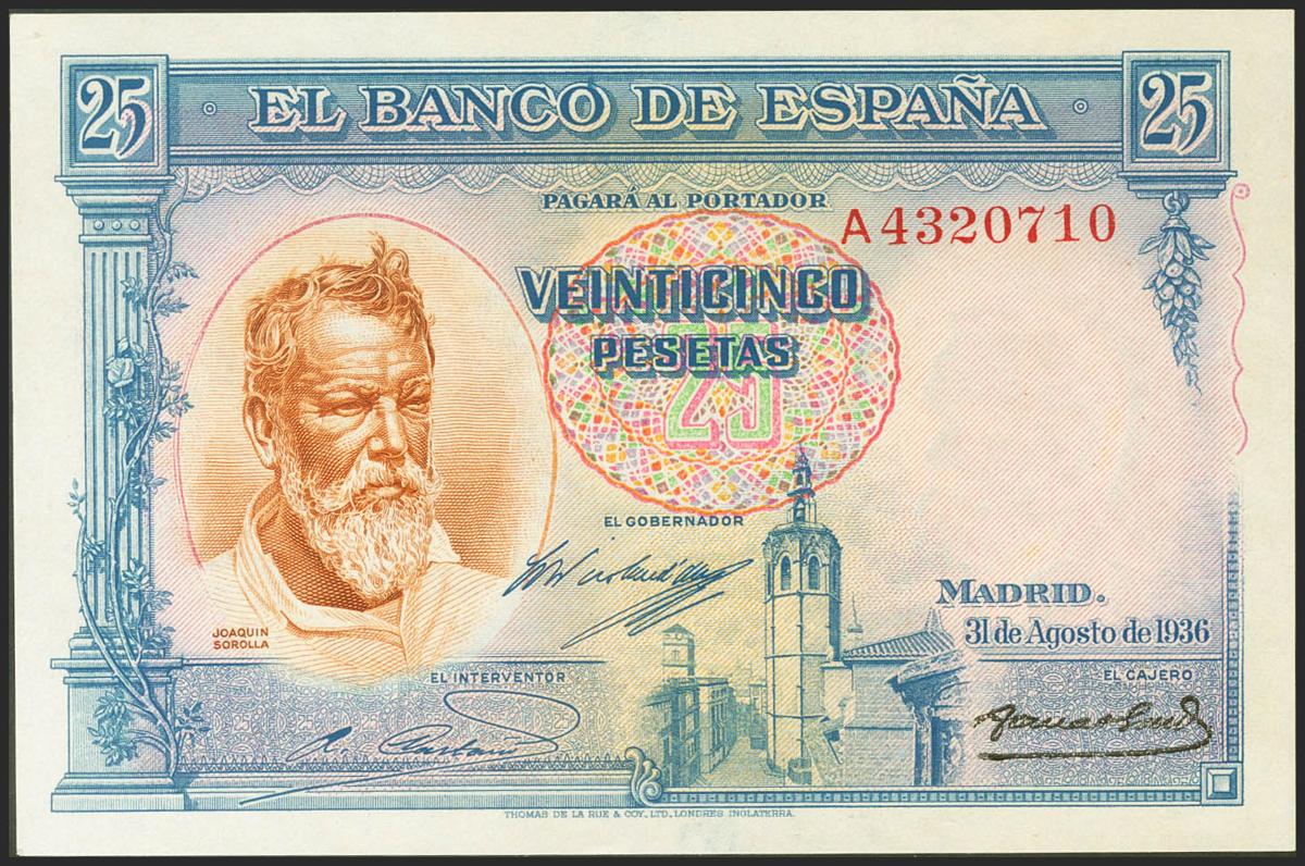 25 pesetas. August 31, 1936. Series A. (Edifil 2021: 367a). It retains all its original sizing. Almost Uncirculated.
