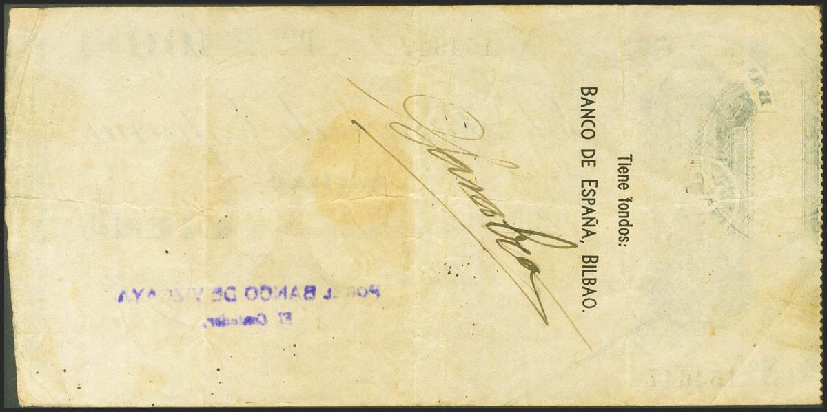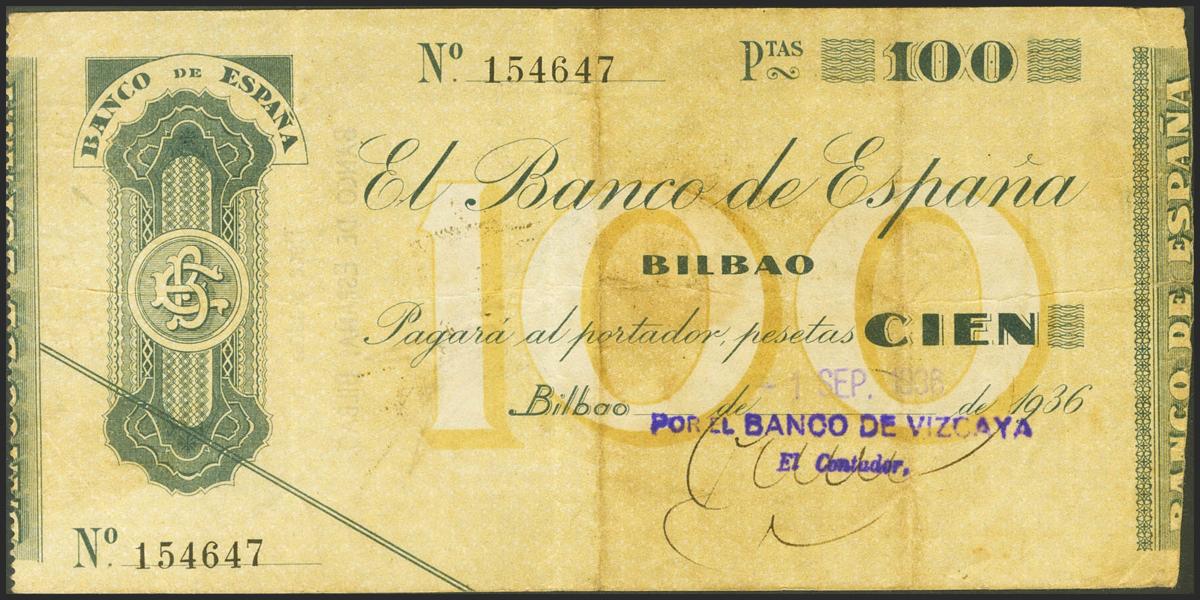 100 pesetas. 1936. No series. Bilbao branch and presigned Banco de Vizcaya. (Edifil 2021: 371b). Very Fine.