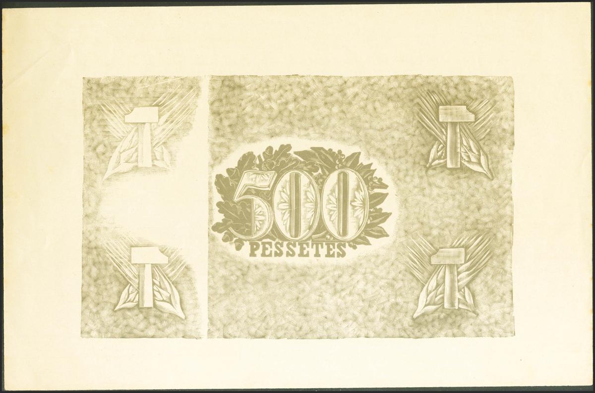 (1938ca). Color proof in gray of the reverse of an unissued 500 Pesetas banknote of the Generalitat de Catalunya. very rare Good Extremely Fine.