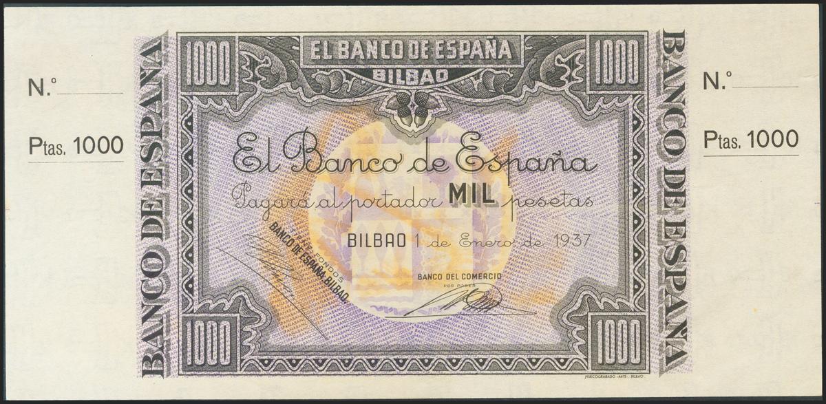 1000 Pesetas. January 1, 1937. Bilbao branch, presigned by Banco del Comercio. Without series and without numbering, with both matrices. (Edifil 2017: NE27c). Natural wrinkle of the paper. Almost Uncirculated.