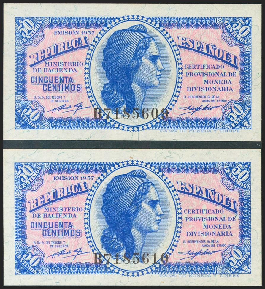 50 cents. 1937. Correlative couple. Series B. (Edifil 2021: 391). Original sizing. Uncirculated.