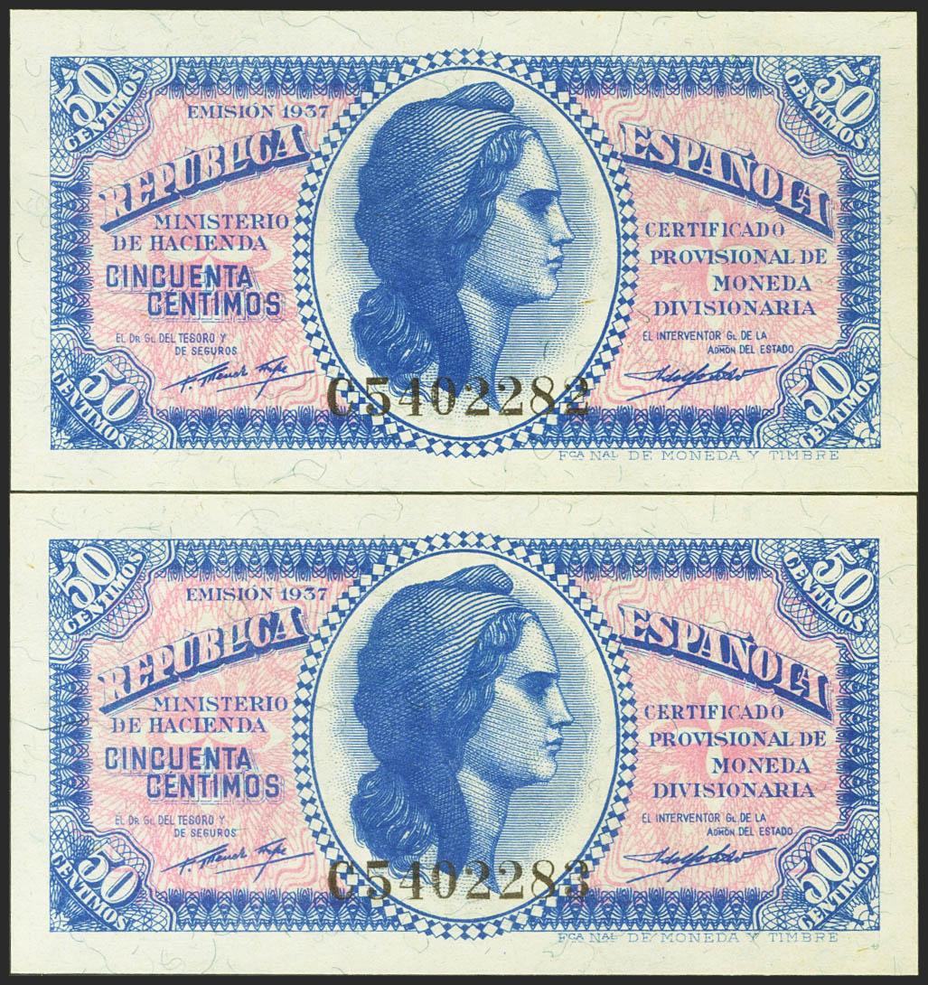 50 cents. 1937. Correlative couple. Series C, last series issued. (Edifil 2021: 391a). Original sizing. Almost Uncirculated.