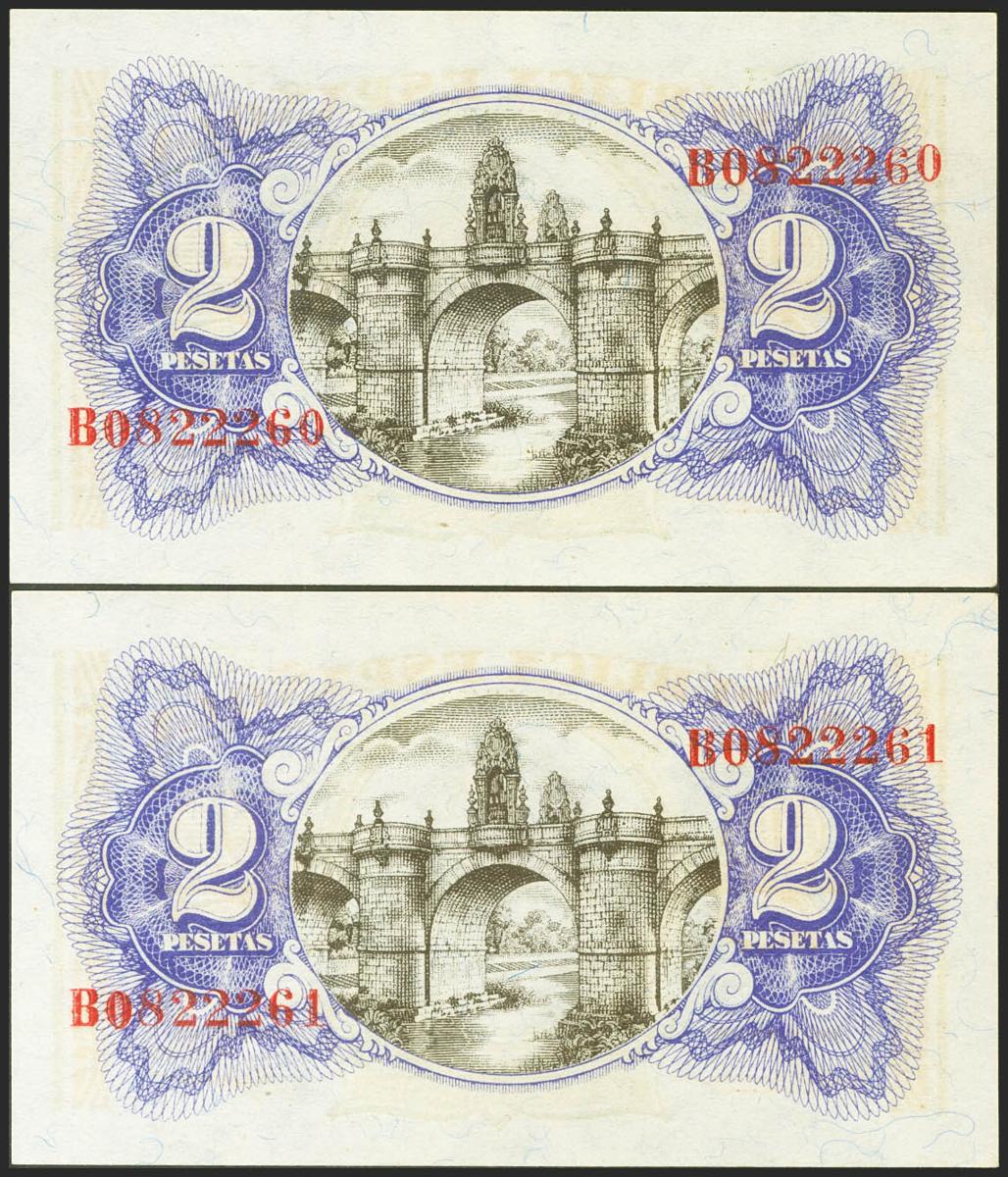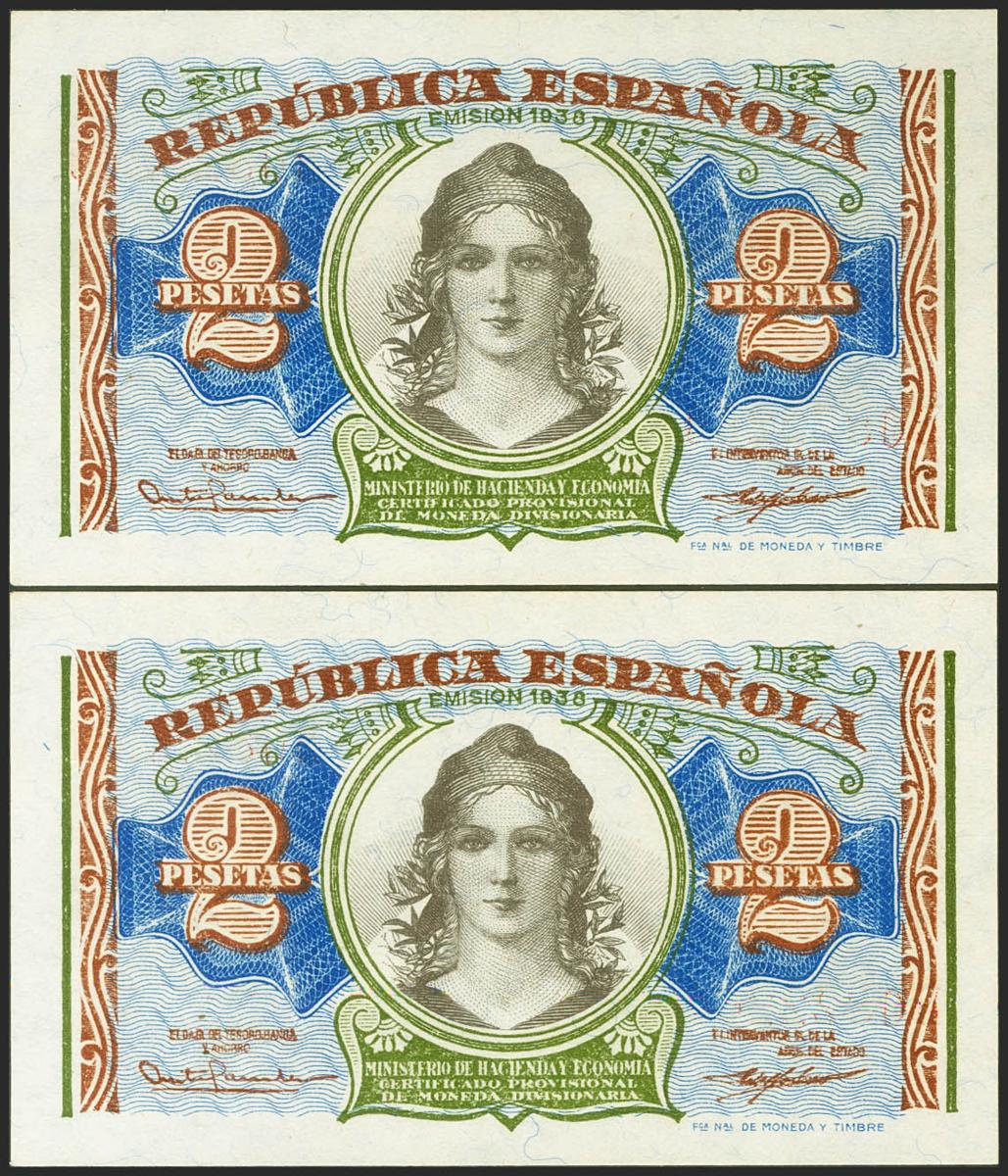 English 2 pesetas. 1938. Correlative couple. Series B. (Edifil 2021: 393). Original sizing. Uncirculated.