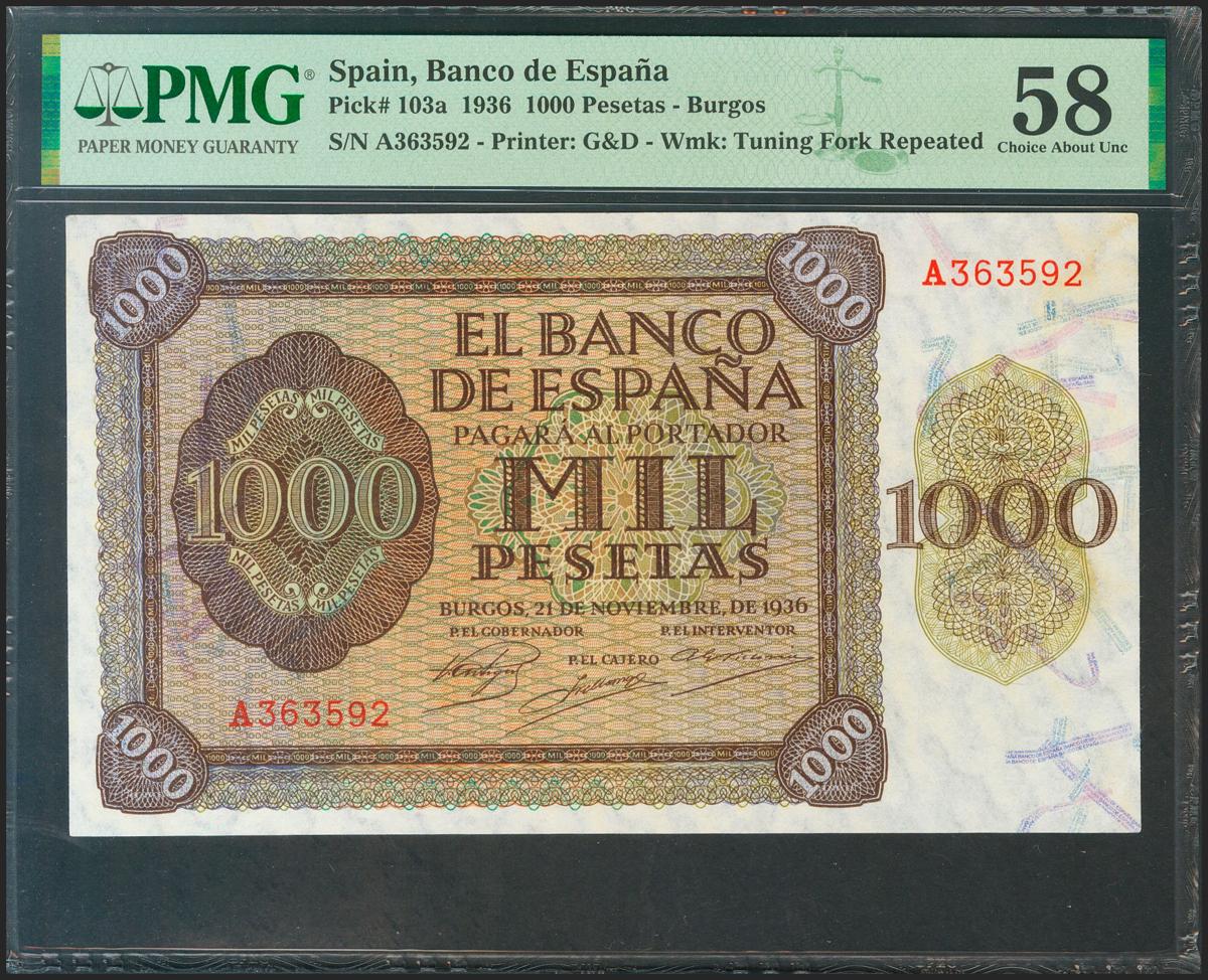 1000 Pesetas. November 21, 1936. Series A. (Edifil 2017: 423). Unusual like that. Good Extremely Fine. PMG58 encapsulation. (To get an idea of the rarity of this note in this quality, PMG gives this note the tenth best rating on November 1, 2021, along with five others).