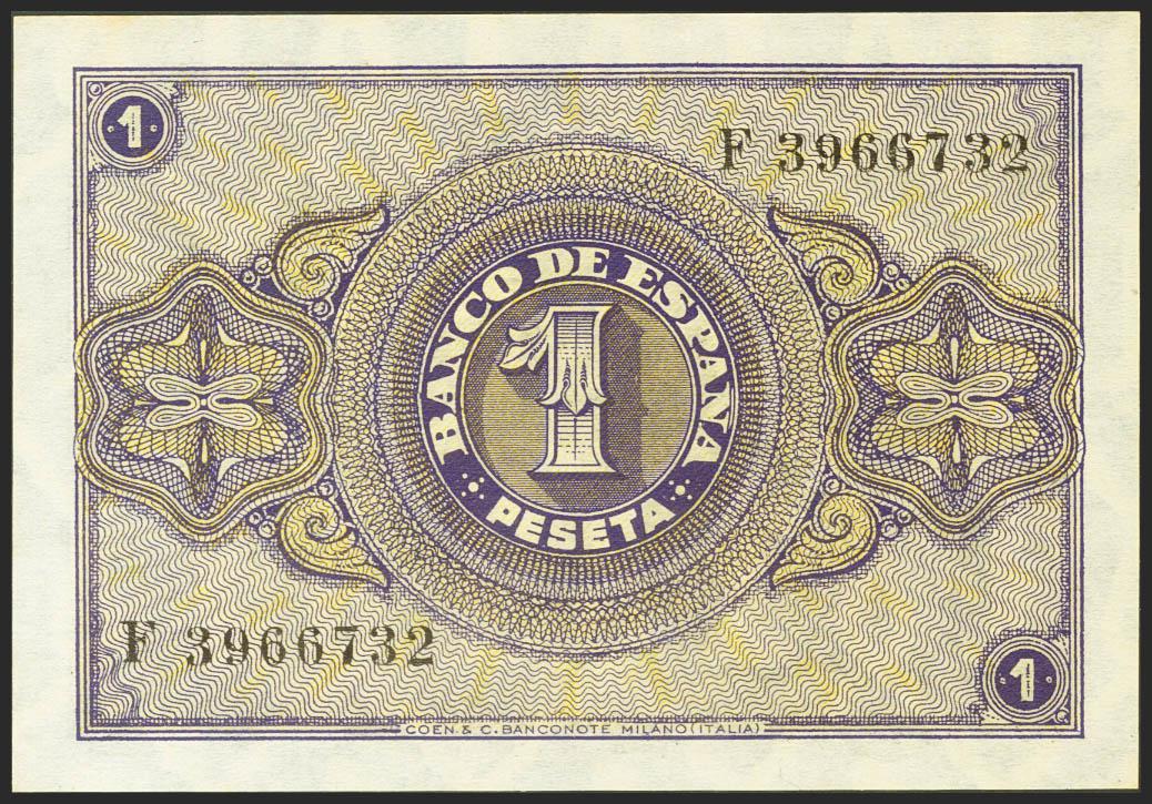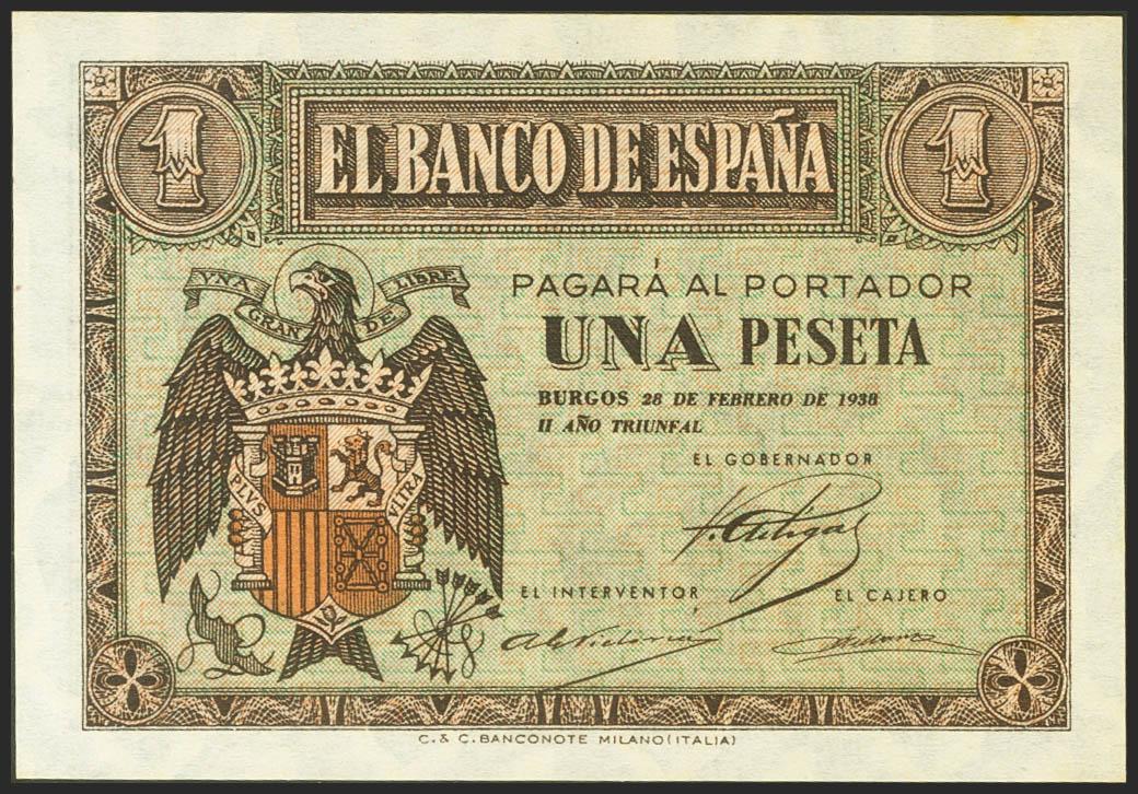 English 1 Peseta. February 28, 1938. Series F. (Edifil 2021: 427a). It retains all its original sizing, unusual in this superlative quality. Uncirculated.