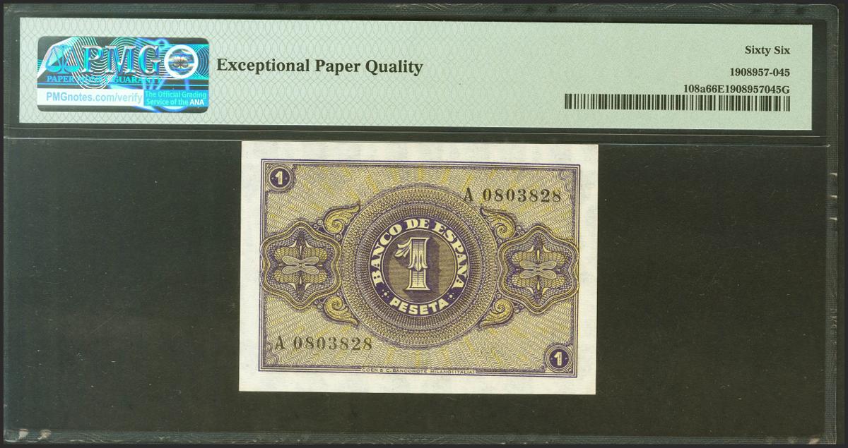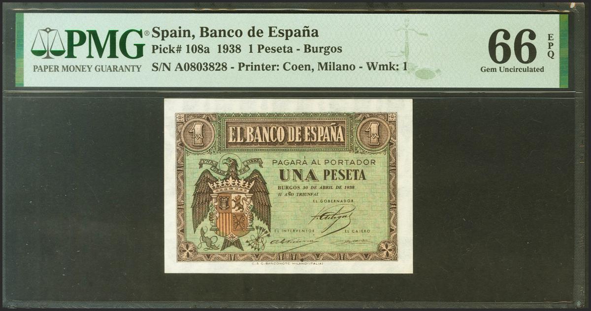 English 1 Peseta. April 30, 1938. Series A. (Edifil 2021: 428, Pick: 108a). Original sizing. PMG66EPQ package.