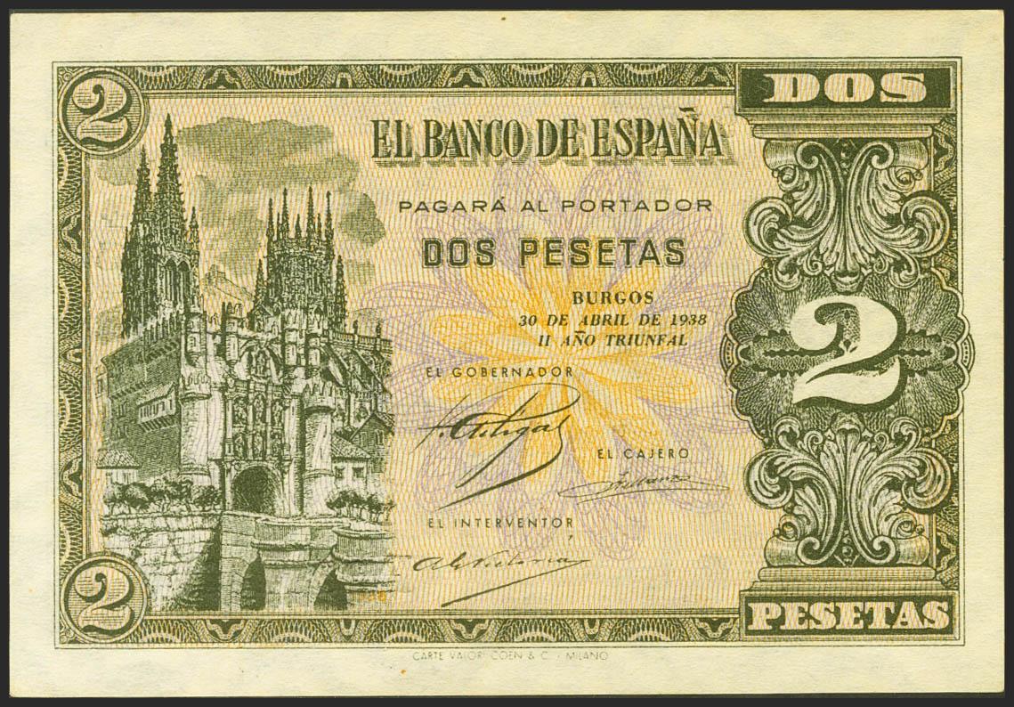 English 2 pesetas. April 30, 1938. Series F. (Edifil 2021: 429a). It retains all its original sizing. Uncirculated.