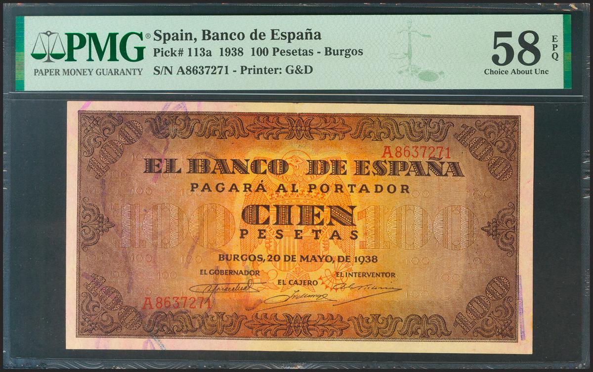 100 pesetas. May 20, 1938. Series A. (Edifil 2021: 432, Pick: 113a). Original sizing. EBC+++. PMG58EPQ package.